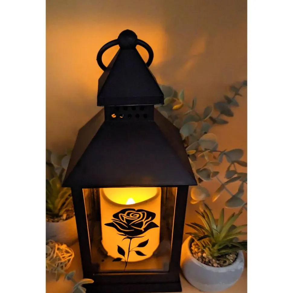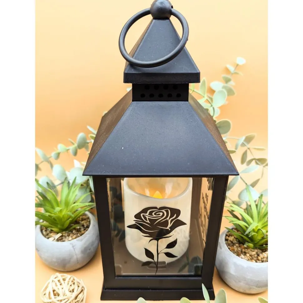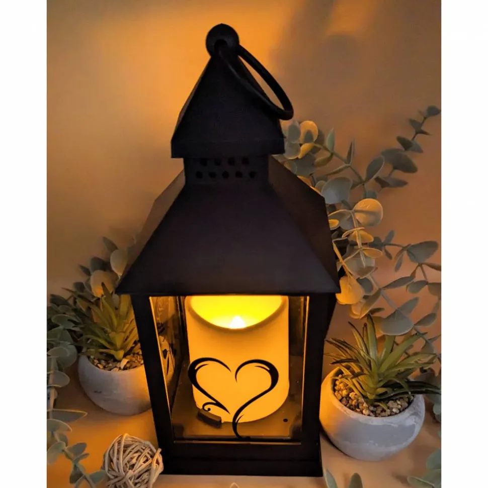 Die Laterne hat 4 Seiten. Auf die Tür (vorne) kann ein Name. Auf den anderen Seiten befinden sich 2x ein Blumenmotiv und hinten ein Herz.
