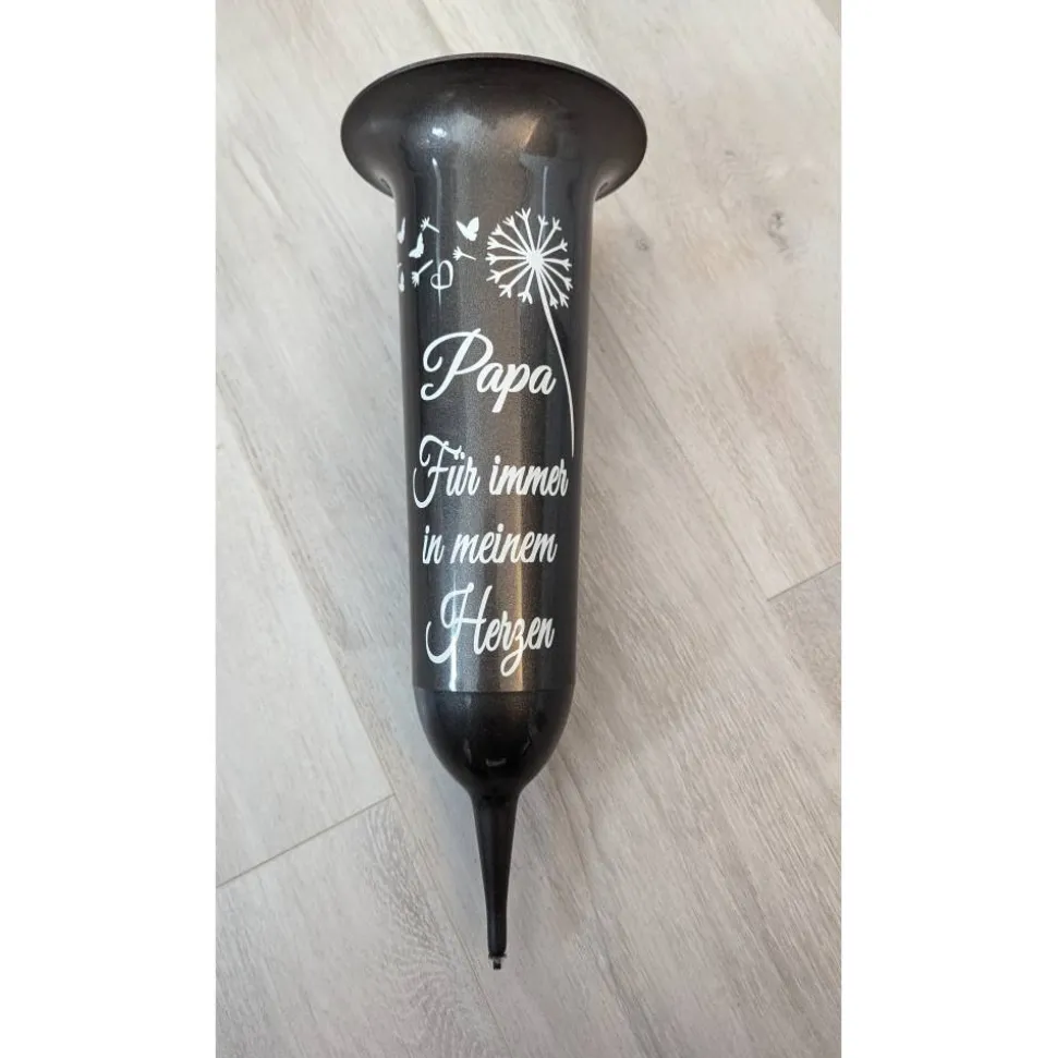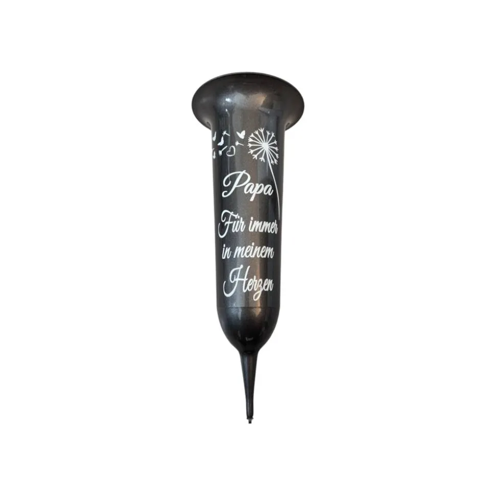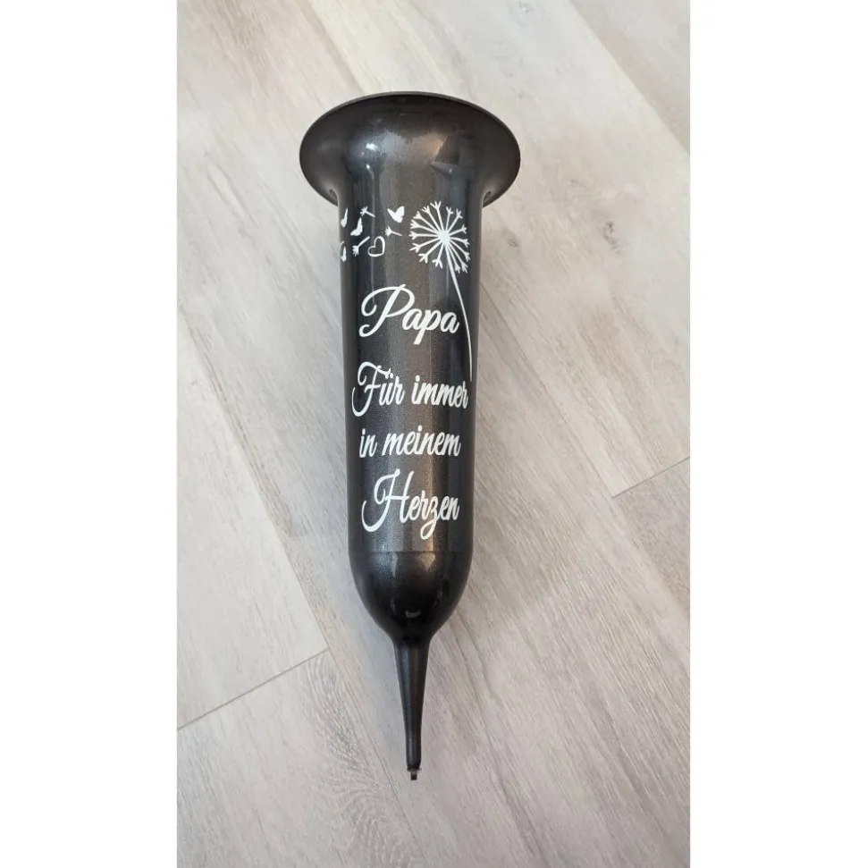 Diese hochwertige Grabvase in elegantem Anthrazit besticht durch ihr feines Pusteblumen-Motiv und einen liebevollen Spruch, der Trost spendet.