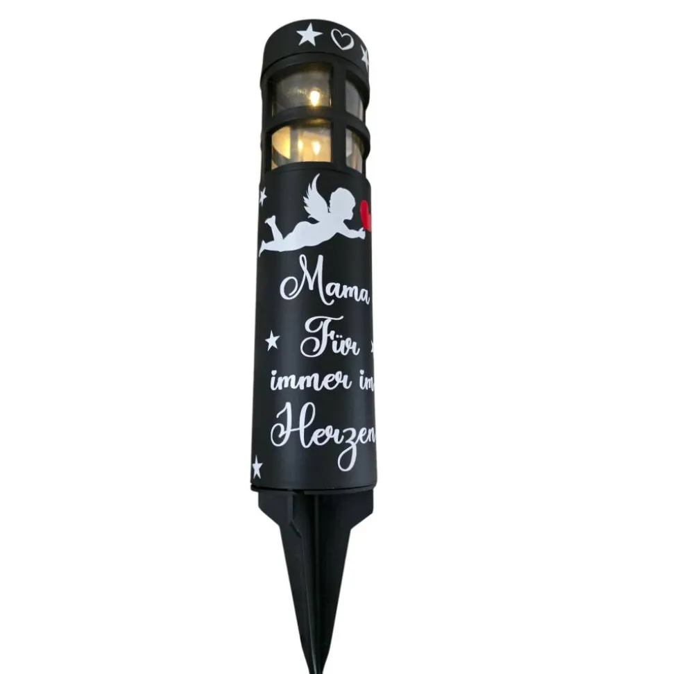 Die Solarleuchte wird personalisiert mit hochwertiger Vinylfolie, die extra für den Outdoor Bereich ist.