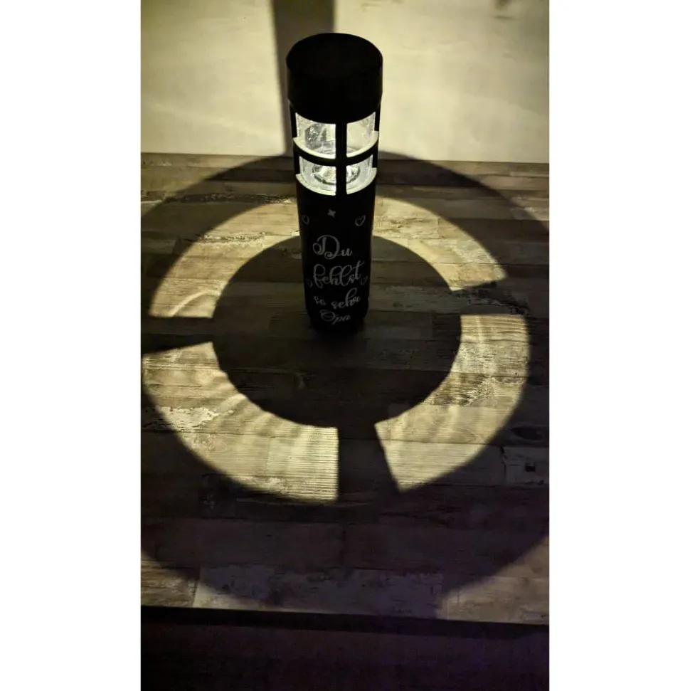 Die Solarleuchte wird personalisiert mit hochwertiger Vinylfolie, die extra für den Outdoor Bereich ist.