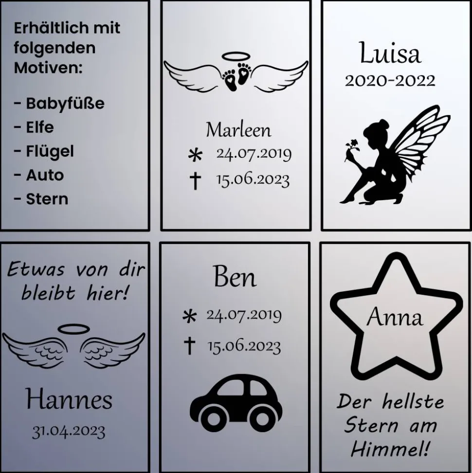Die schlichte Eleganz passt zu verschiedenen Friedhofsstilen und ist sowohl für moderne als auch traditionelle Gräber geeignet. Sie können zwischen verschiedenen Motiven wählen, um die Grablaterne perfekt an deine Wünsche anzupassen.