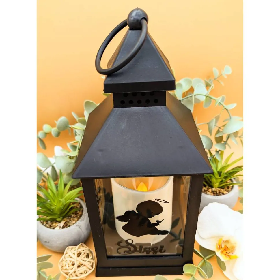 Die Led Laterne hat 4 Seiten. Auf die Tür (vorne) kann ein Name. Auf den anderen 3 Seiten sind 3 Motive. 2X Blumen 1x Spruch