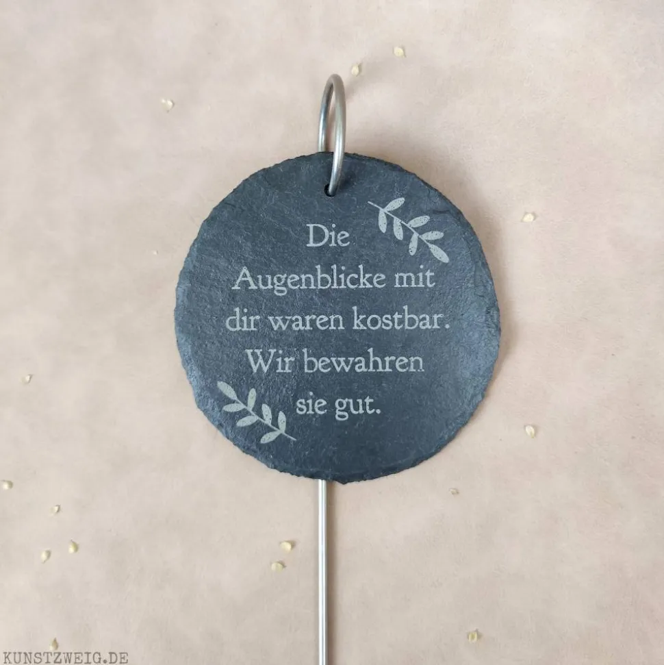 Die Schiefertafel mit wundervollem Trauerspruch kann mit Hilfe des Erdstabes auf das Grab gesteckt werden. Du kannst es auch verschenken, um Angehörigen deine Anteilnahme auf besondere Weise mitzuteilen.