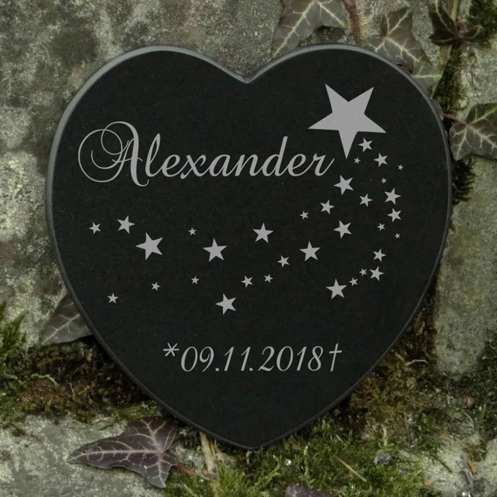 Und zum Produktsortiment gehört nun Grabschmuck speziell für Sternenkinder mit einzigartiger Sternschnuppe, Namensgravur und dem einen Geburts- bzw. Sterbedatum des geliebten Babys.