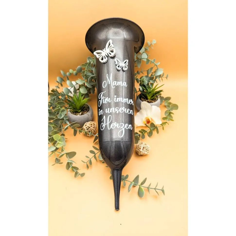 Möchten Sie einen anderen Text als ( Für immer in unseren Herzen) bestellen Sie diese Grab Vase mit Ihren Wunschtext. Bedenken Sie umso mehr Text umso kleiner die Schrift.