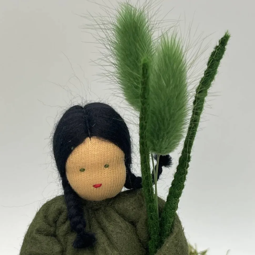 Das Püppchen ist unten geschlossen und für einen guten Stand unten mit feinem Dekokies und der Rest mit reiner Schurwolle gefüllt.