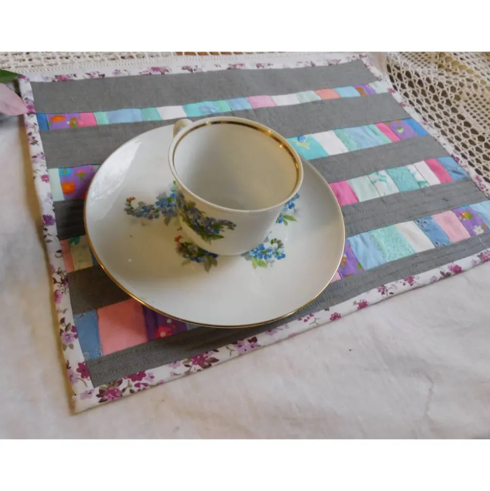ein schönes graues Tischset mit Streifen in Pastelltönen rosa , hellblau und weiß