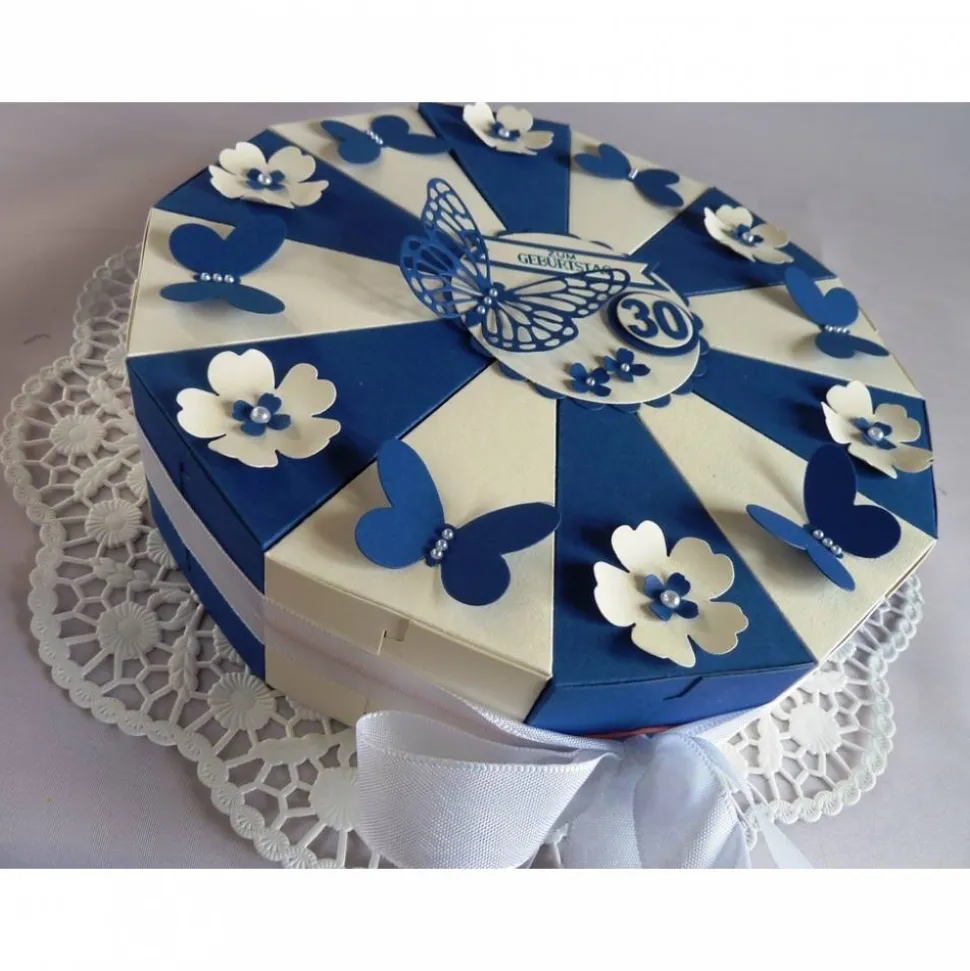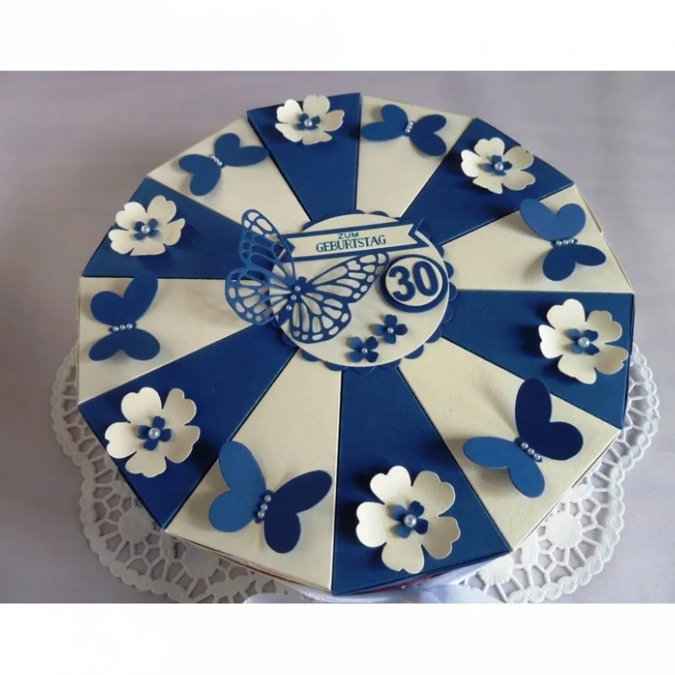 Du bist zum Geburtstag eingeladen und suchst eine schöne Verpackung um Geld zu verschenken? Da bietet sich meine aufwändig gearbeitete Schachteltorte aus blauem und weißen Tonkarton an, dekoriert mit Schmetterlingen, Blüten und weißen Halbperlen. Die Torte steht auf einer Papier-Tortenspitze, die Mitte ziert ein großer Schmetterling, kleine Blüten, ein gestempelter Geburtstagsgruß und die Anzahl der Jahre.