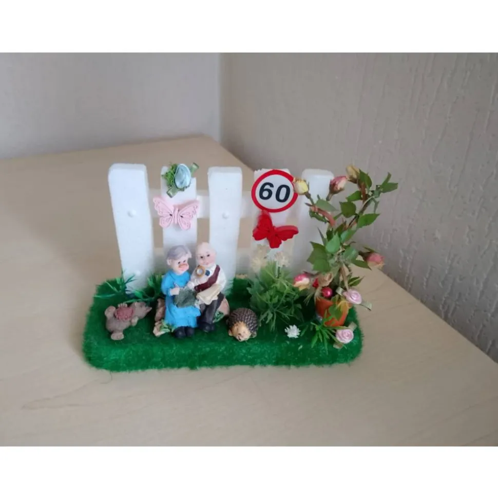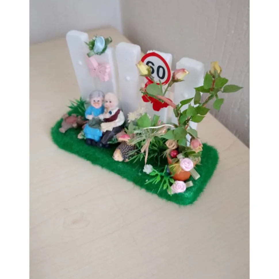 Überrasche deine Großeltern mit einem liebevoll gestalteten Geschenk vom SaBienchenshop: Die detailreiche Gartenszene zeigt ein älteres Pärchen – Oma & Opa – umgeben von einer Katze, einem Igel und Schmetterlingen am Zaun. Oma ist mit dem Strickzeug beschäftigt und Opa liest die Zeitung. Weiterhin steht ein Rosenbusch auf der Platte, den ich selbst hergestellt habe. Es ist also einiges an Handarbeit am Geschenk. Die Szene ist auf einer Platte von 16 x 6,5 cm mit einer Höhe von ca. 10,5 cm arrangiert und eignet sich perfekt als Geschenk zum Geburtstag, Hochzeitstag, Jubiläum oder als besondere Überraschung. Platte ist wohl nicht ganz richtig. Hierbei handelt es sich um ein Gebilde aus Styropor , die Platte, an ihr ist der Zaun integriert. Nun zum Thema 2. Wahl. Zwei Zaunlatten sind am oberen Ende beschädigt. Ich habe versucht es zu kaschieren mit einer Blüte und der Zahl 60. Somit wäre es ein Geschenk zum 60. Hochzeitstag.