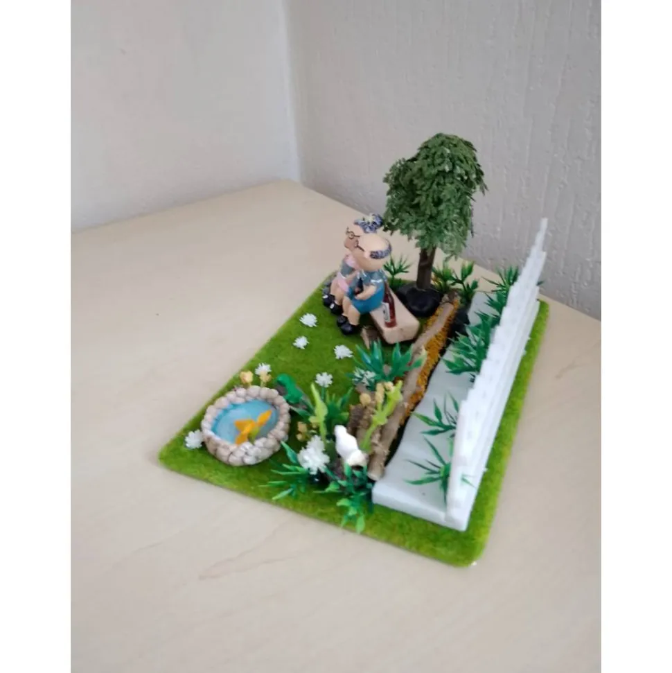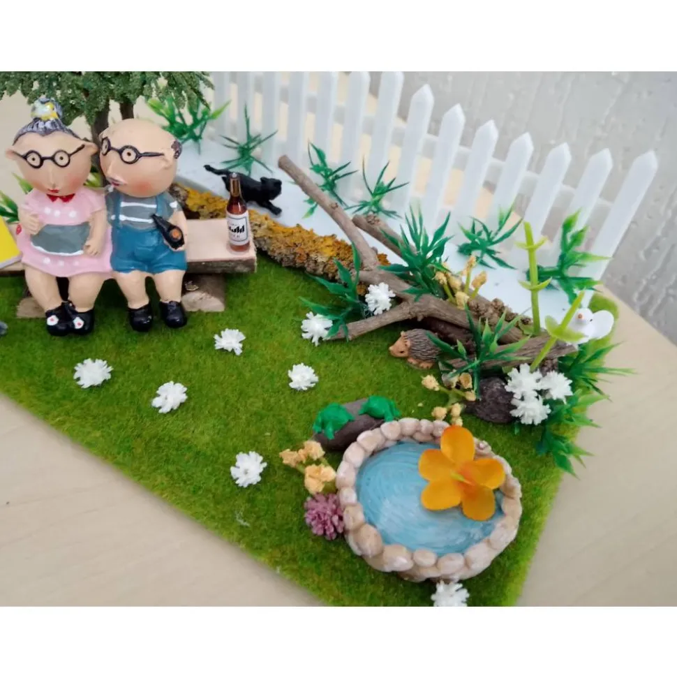 Überrasche deine Großeltern mit einem liebevoll gestalteten Geschenk vom SaBienchenshop: Die detailreiche Gartenszene zeigt ein älteres Pärchen – Oma & Opa – umgeben von einer Katze, Mäusen, einem Igel und Fröschen am kleinen Teich. Die Szene ist auf einer Platte von 13 x 18 cm mit einer Höhe von ca. 10 cm arrangiert und eignet sich perfekt als Geschenk zum Geburtstag, Hochzeitstag, Jubiläum oder als besondere Überraschung.