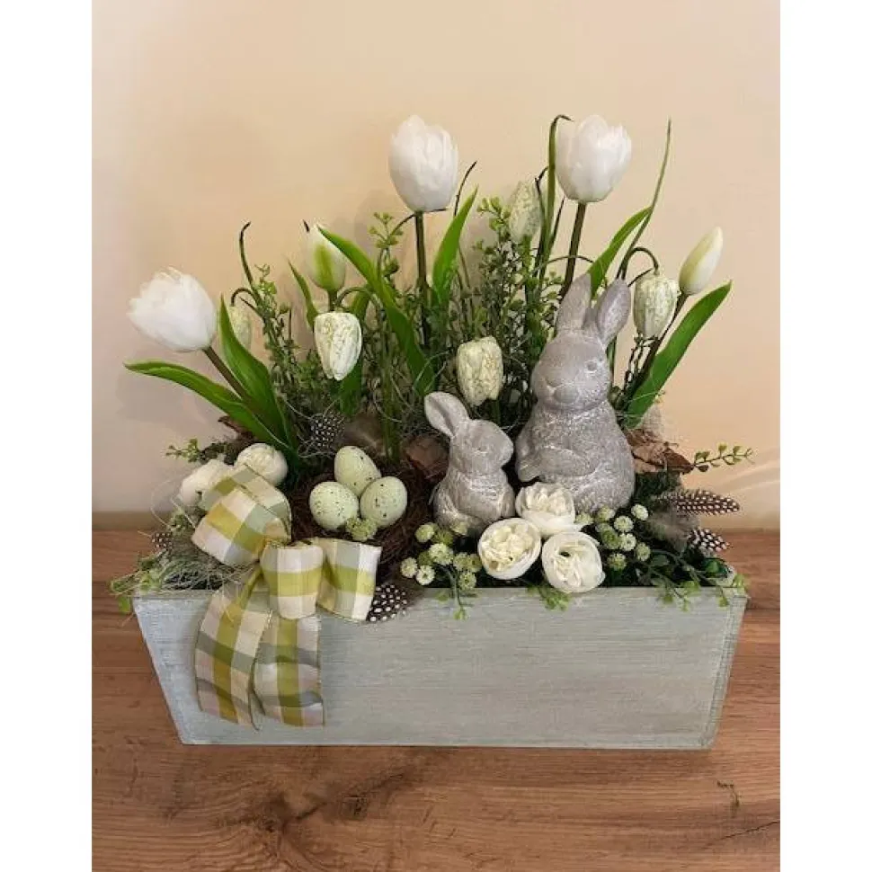 Wunderschönes großes Frühlingsgesteck mit verschiedenen hochwertigen Seidenblumen in einer grünen Holzkiste.