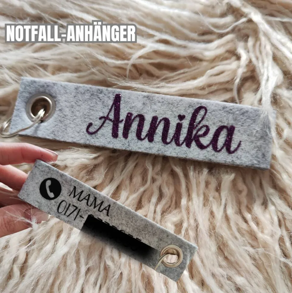 ✨ Filz-Schlüsselanhänger mit Notfallkontakt – Der Name des Kindes auf der Vorderseite, auf der Rückseite die Kontaktinformationen der Eltern für mehr Sicherheit.