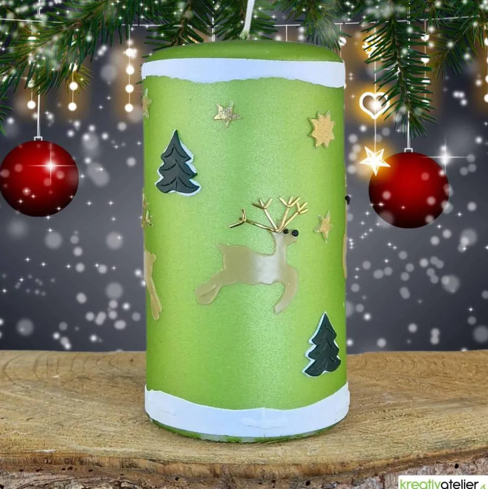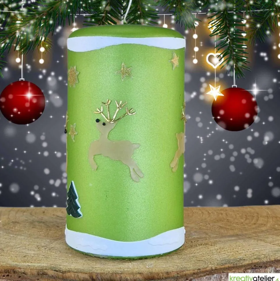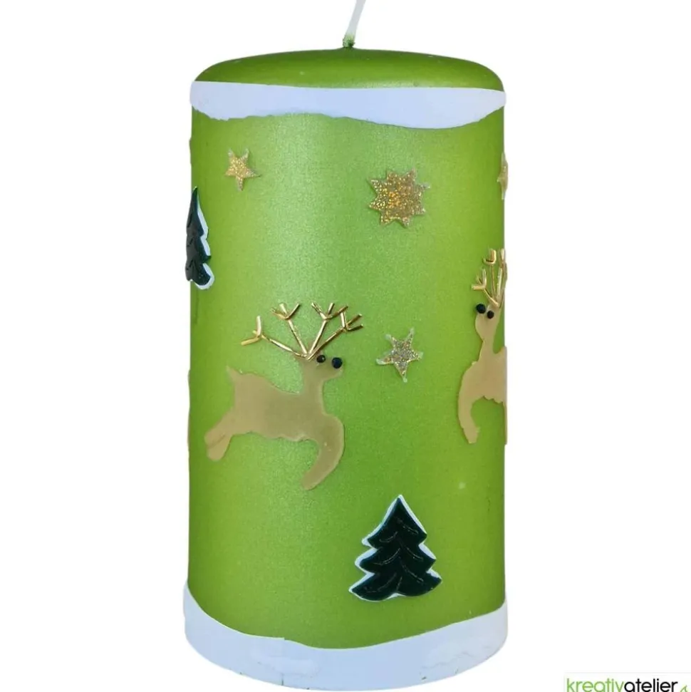 Meine Weihnachtskerzen werden aufwändig von Hand mit Wachs verziert. Zunächst wurde die Oberfläche dieser Kerze mit einer Kerzenfolie in grün überzogen. Dadurch bekommt sie den Metalliceffekt. Die Weihnachtskerze ist rundum mit Schnee, Rentieren, Tannen und Sternen verziert. Die detailreich gestalteten Rentiere mit ihrem gold-glänzenden Geweih springen munter umher. Schneebedeckte Tannen bilden den Hintergrund. Die Tannen bestehen aus zwei Wachslagen und heben sich daher deutlich von der Kerze ab. Oberer und unterer Rand der Kerze sind umlaufend mit weißem Wachs gestaltet, der teilweise mehrlagig gearbeitet ist.