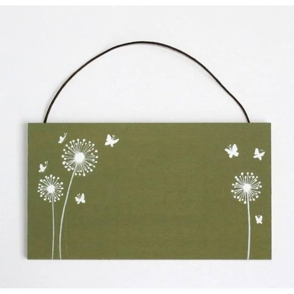 Das Schild wird nach deinen Vorgaben personalisiert: Du wählst Familienname und Schriftart (Auswahltabelle bei den Fotos). Standardmäßig pistaziengrün grundiert, kannst du auf Wunsch auch Farben wie Hellgrau, Dunkelgrau, Dunkelblau, Bordeauxrot oder Schwarz wählen – eine Nachricht beim Kauf genügt. Links und rechts verzieren handgemalte Pusteblumen und fliegende Schmetterlinge das Namensschild.