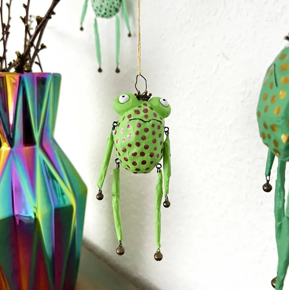 Dieses entzückende Froschglöckchen habe ich aus Papier und Draht hergestellt, bemalt und mit Glöckchen und Bronzekrone dekoriert. Es macht sich hervorragend im Osterstrauß, am Türkranz oder als kleines Geschenk.