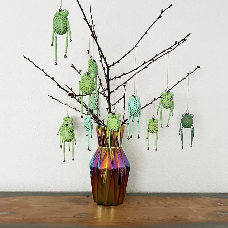 Dieses drollige Froschglöckchen habe ich aus Papier und Draht hergestellt, bemalt und mit Glöckchen und Bronzekrone dekoriert. Es macht sich hervorragend im Osterstrauß, am Türkranz oder als kleines Geschenk.
