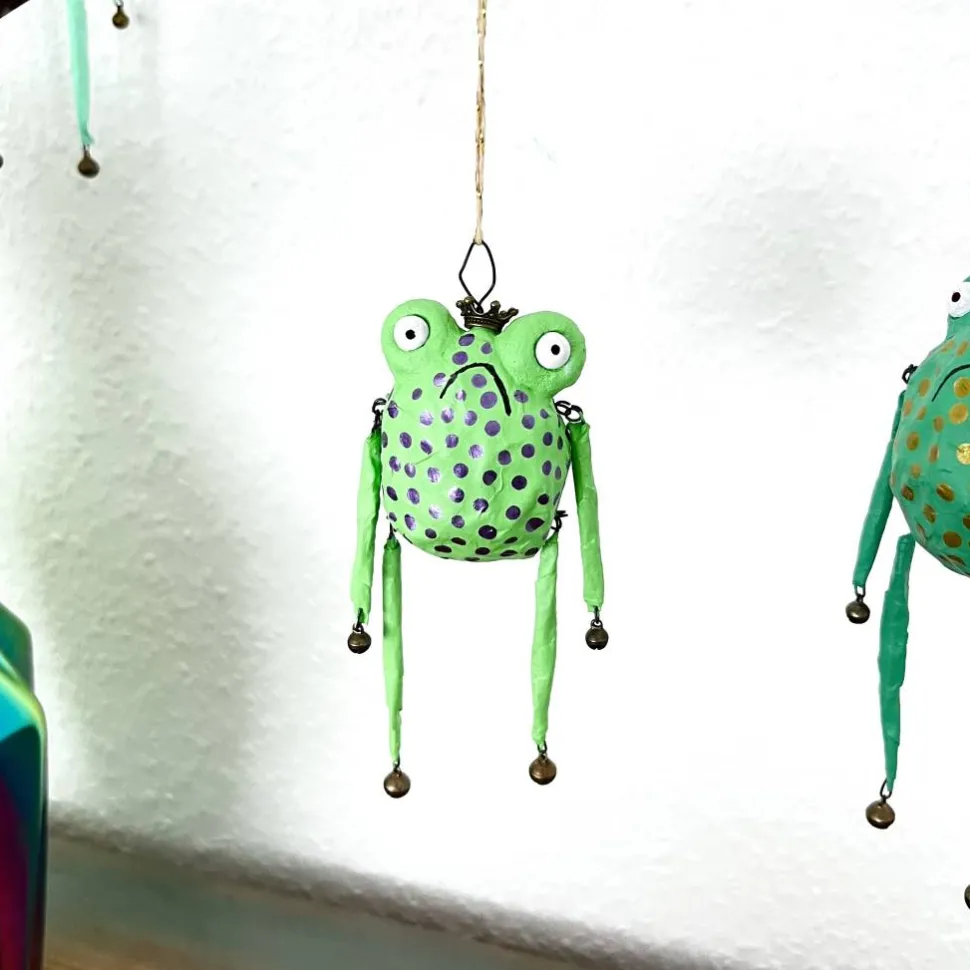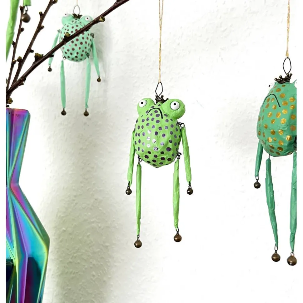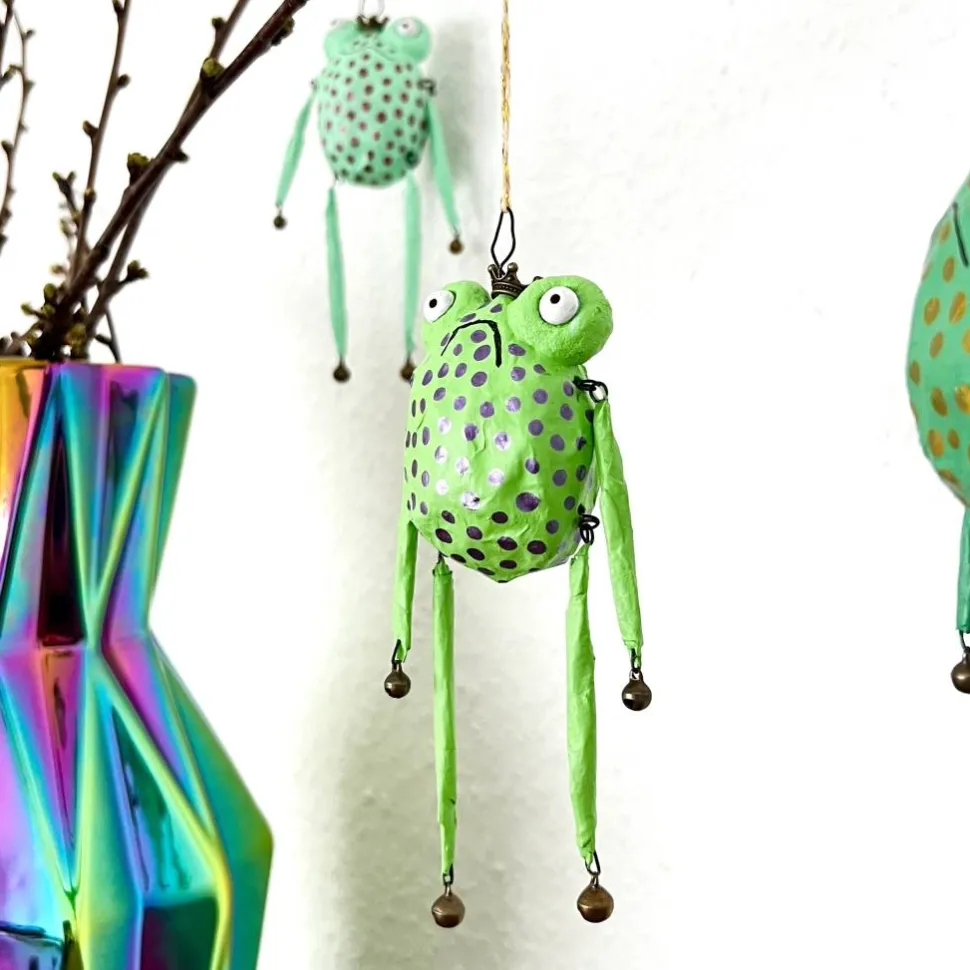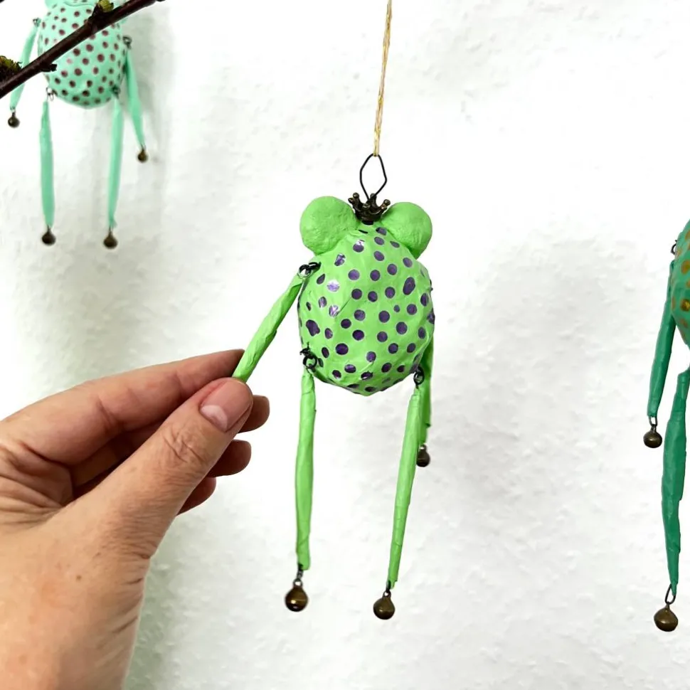 Dieses entzückende Froschglöckchen habe ich aus Papier und Draht hergestellt, bemalt und mit Glöckchen und Bronzekrone dekoriert. Es macht sich hervorragend im Osterstrauß, am Türkranz oder als kleines Geschenk.