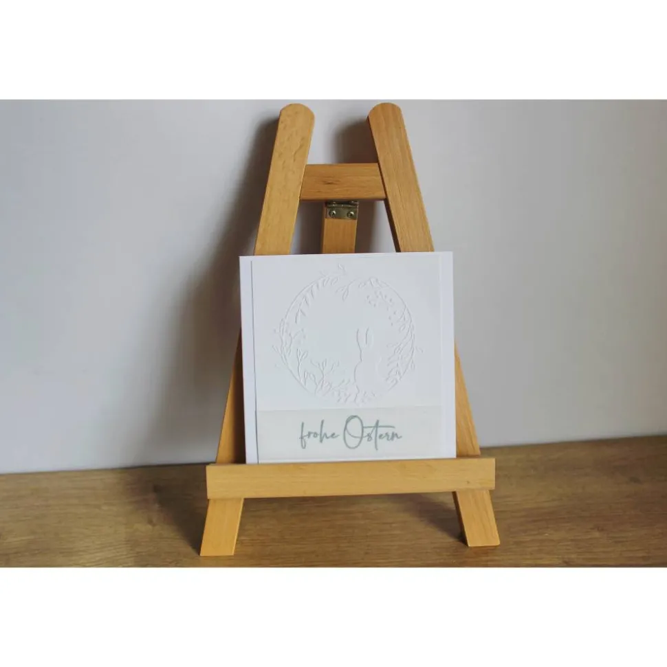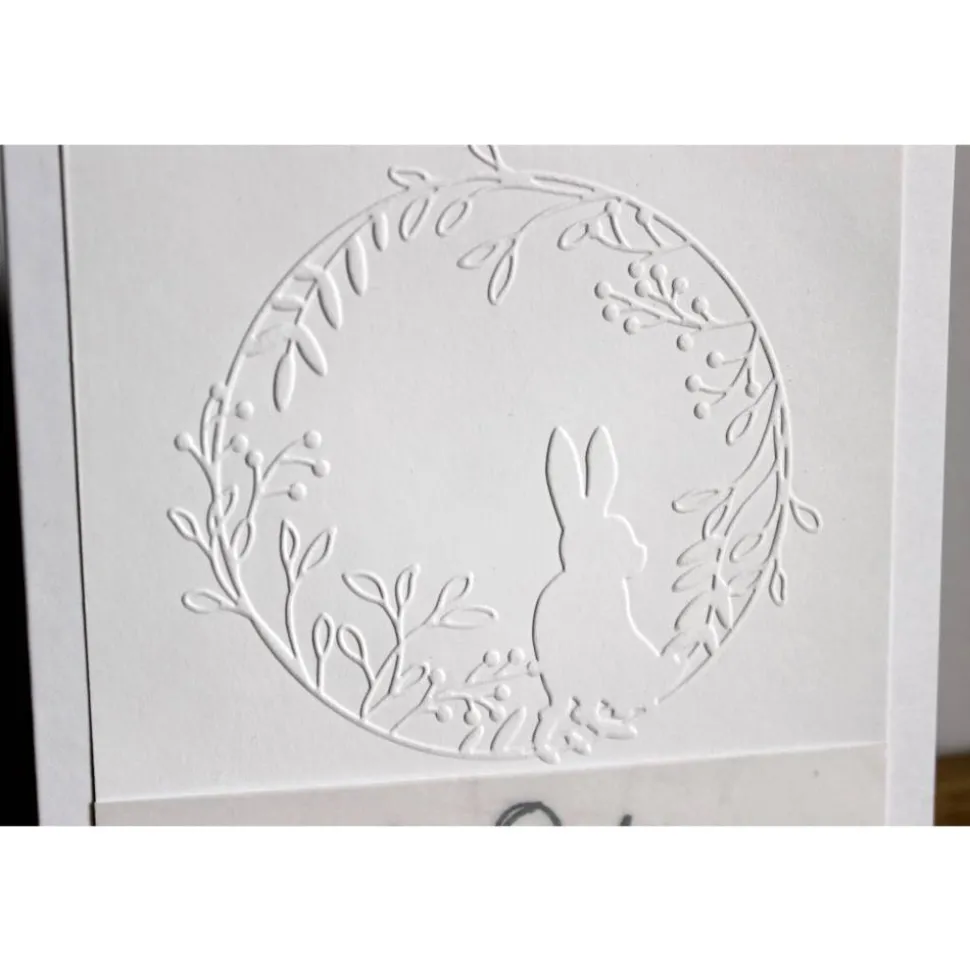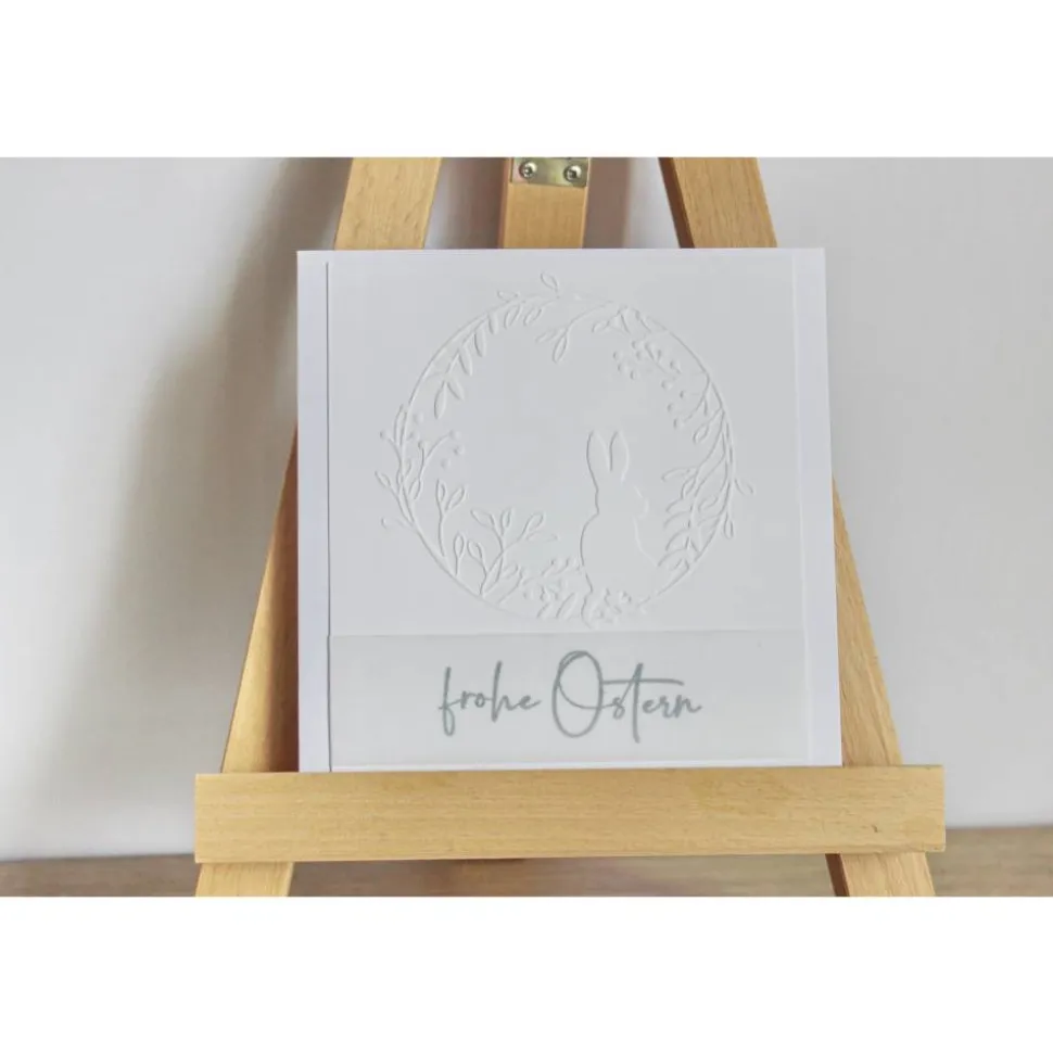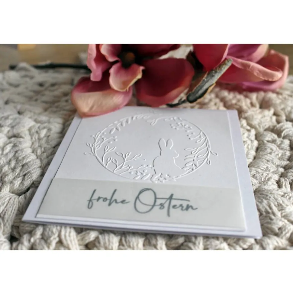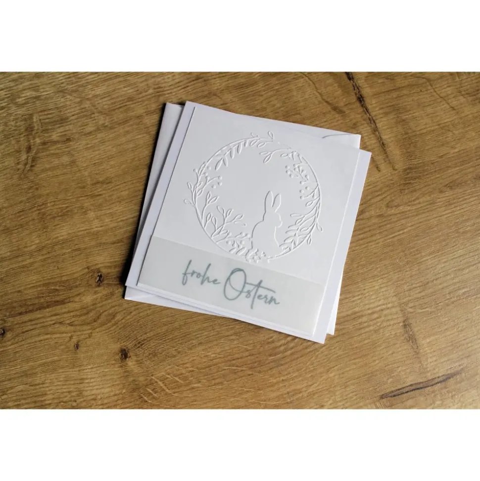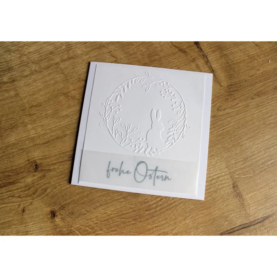Die Karte selbst ist in schlichtem weiß gehalten, der Kranz mit dem Hasen auf dem Aufleger geprägt. Abgerundet wird das Ganze mit Grüßen, die in zartem grau auf Transparentpapier gestempelt sind.