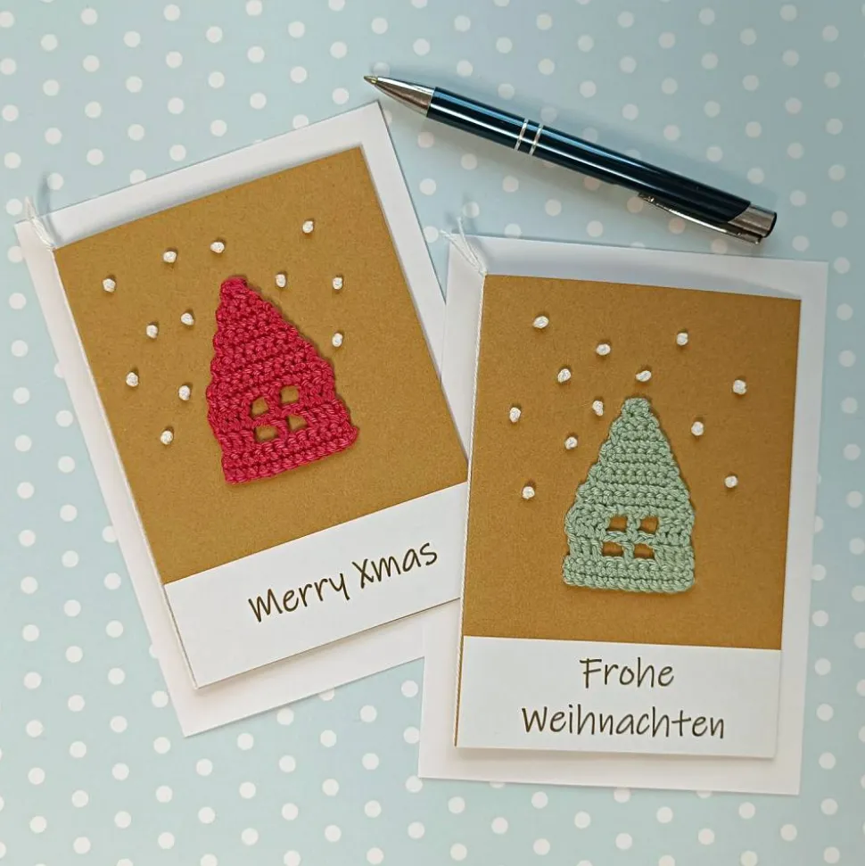 Dieser Spruch passt ganz wunderbar zu meinem Kärtchen. Genau das wollte ich auf dieser hübschen Karte darstellen – ganz minimalistisch. Warme Weihnachtsgrüße im kalten Winter. Das Häuschen, bei welchem die Farbe frei wählbar ist, ist gehäkelt. Die Schneeflocken habe ich eingestickt. Die Klappkarten aus Kraftpapier sind mit weißen Einlegeblättern für viel Platz für ihre ganz persönlichen Worte bestückt. Der weiße Papierstreifen mit Text ist aufgeklebt und kann individuell beschriftet werden.