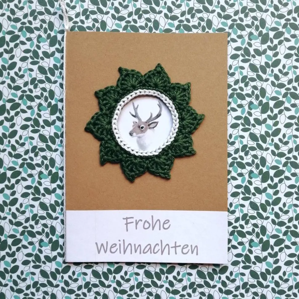 Die im hohen Norden beheimatete Hirschart steht für glitzernde Winterlandschaften und ist fest mit Weihnachten verknüpft. Ich habe für die Grußkarte das anmutige Tier mit einem gehäkelten Kranz eingerahmt, so kommt es besonders schön zur Geltung. Die Klappkarten sind aus Kraftpapier. Der weiße Papierstreifen mit Text ist aufgeklebt und kann individuell beschriftet werden. Die Karten sind mit weißen Einlegeblättern bestückt.
