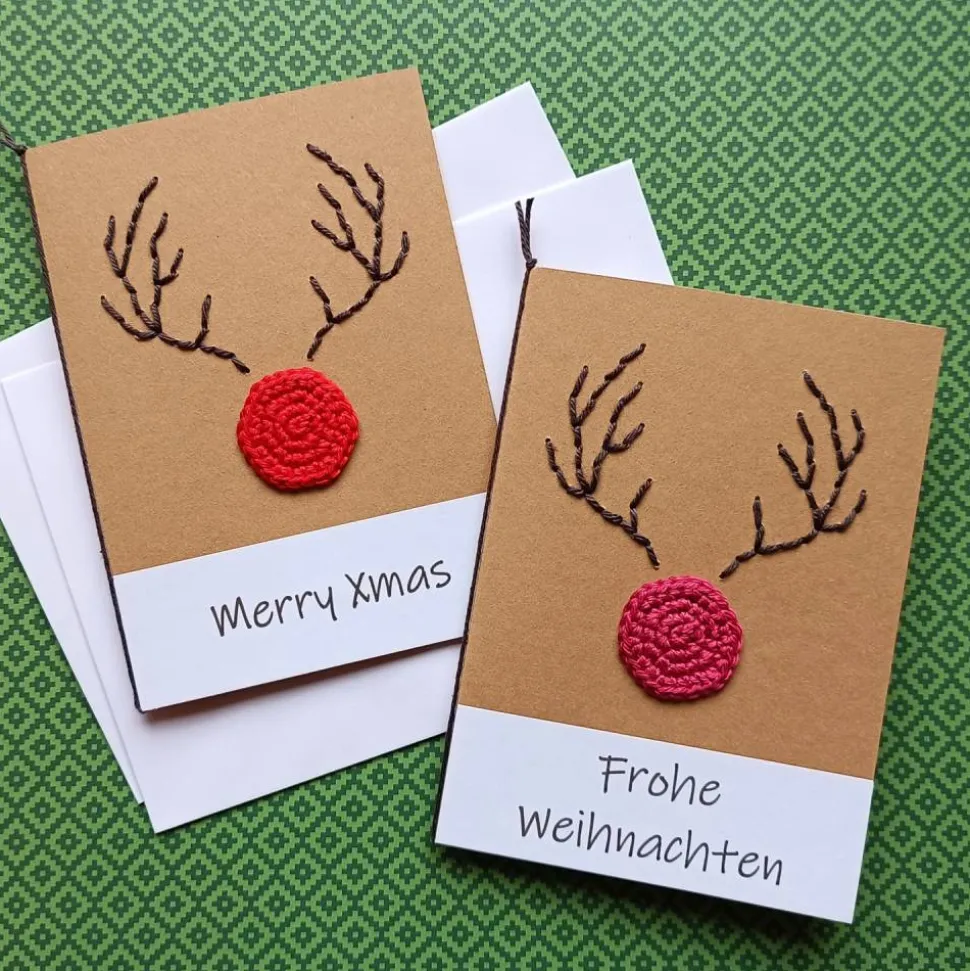 Wegen seiner leuchtend-roten Nase wurde Rudolph von den anderen Rentieren oft ausgelacht. Santa Claus wusste jedoch seine Fähigkeiten zu schätzen. Seither darf das kleine Rentier den Schlitten anführen und beleuchtet mit seiner roten Nase den Weg zu den Kindern dieser Welt. Genau das wollte ich auf dieser hübschen Karte darstellen – ganz minimalistisch. Die rote Nase ist gehäkelt und das prächtige Geweih eingestickt. Die Klappkarten sind aus Kraftpapier. Der weiße Papierstreifen mit Text ist aufgeklebt und kann individuell beschriftet werden. Die Karten sind mit weißen Einlegeblättern für ihre ganz persönlichen Worte bestückt.