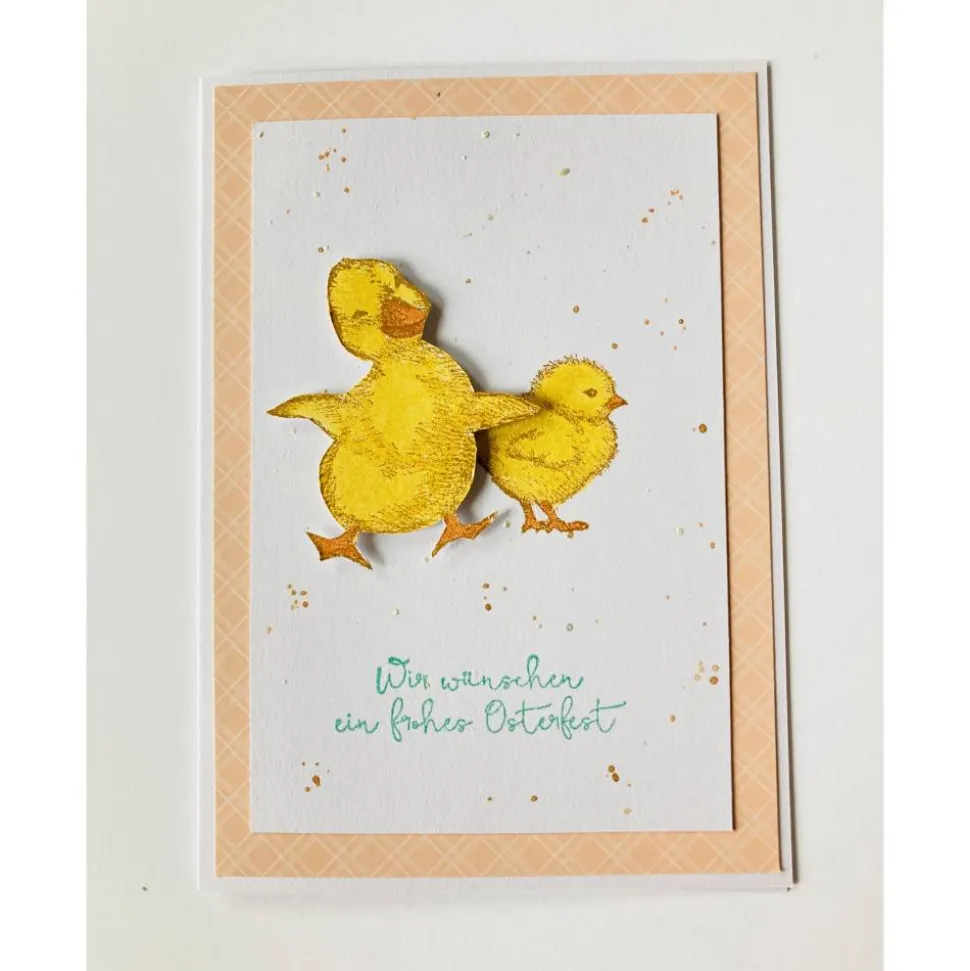 Darauf befindet sich ein weißer Aufleger mit zwei süßen Küken. Diese sind gestempelt und von Hand koloriert.