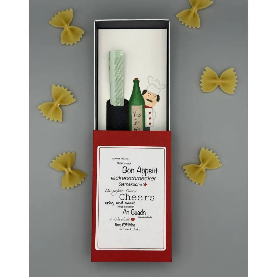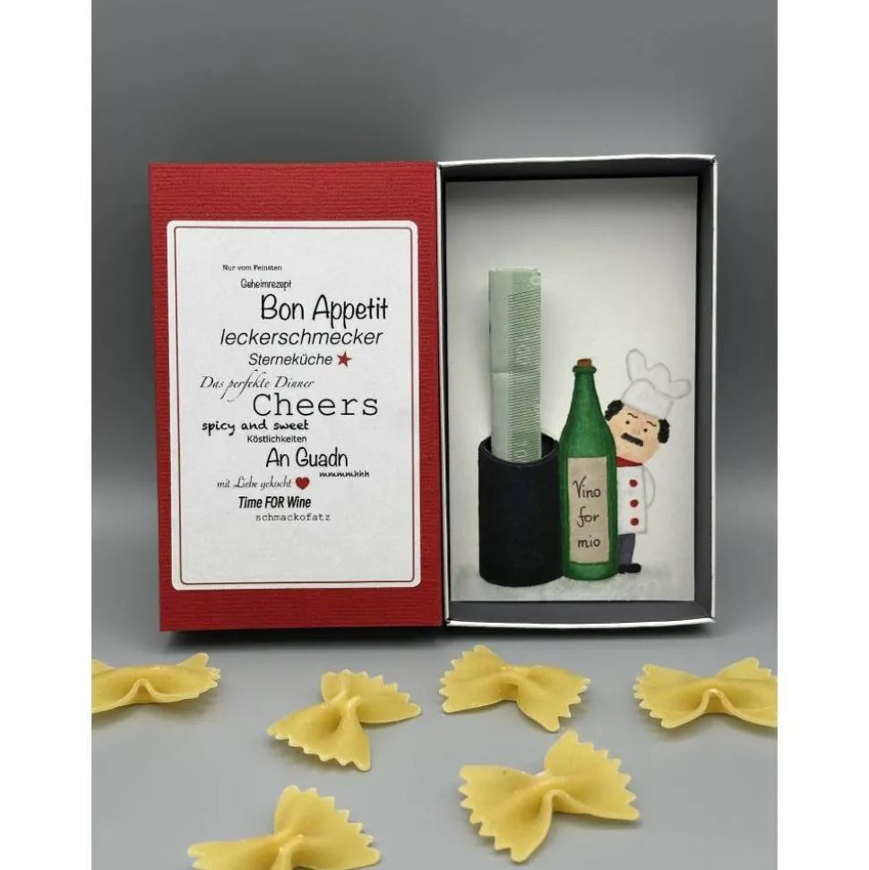 Im Inneren der Schachtel findest du einen handgemalten kleinen Koch mit Weinflasche und einem Topf. In den Topf ist ein Loch gestanzt, damit du ganz einfach deinen Gutschein, eine Einladung oder auch einen Geldschein einstecken kannst. Einfach den Schein oder Gutschein einrollen, platt drücken und in den Topf stecken. Beachte bitte, dass nur ein Schein hineingesteckt werden sollte.