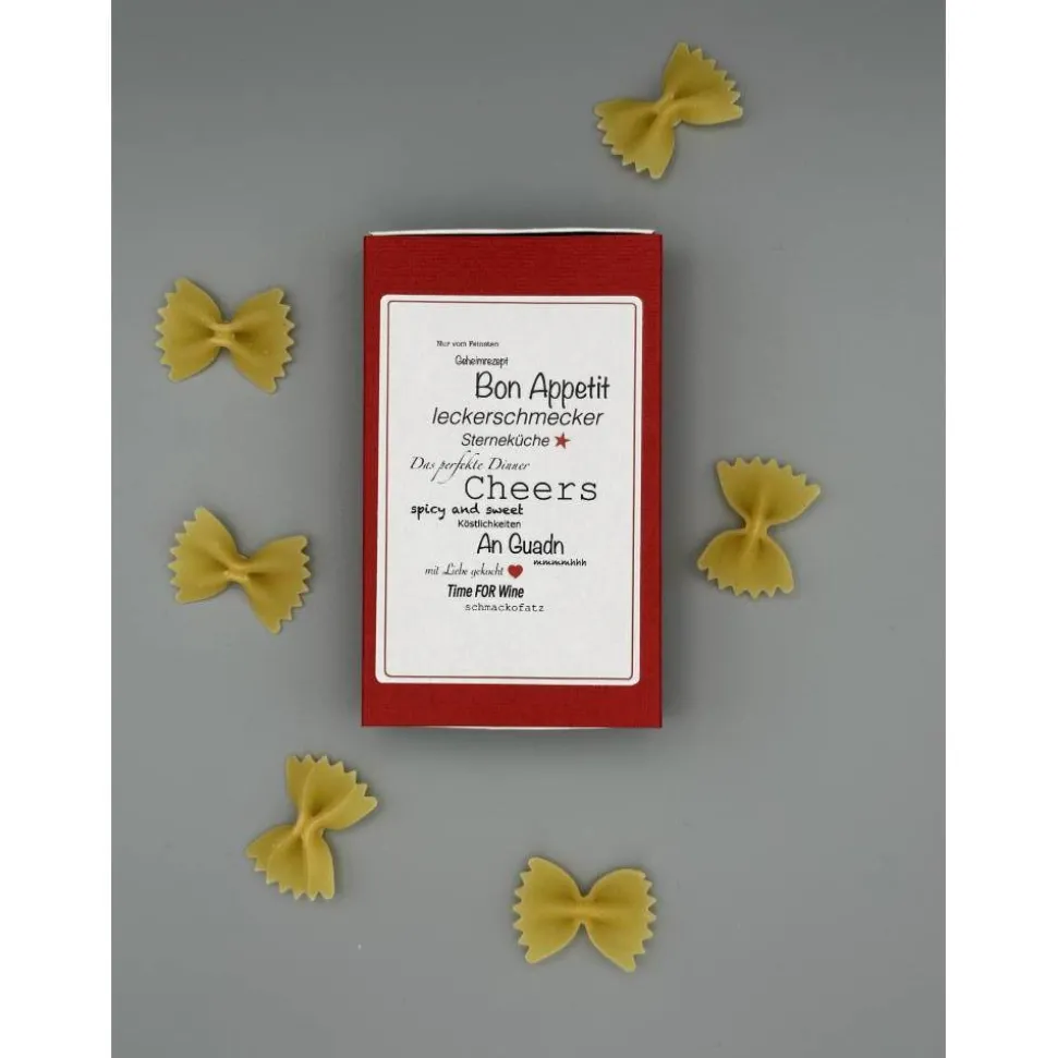 Das Außenteil der stabilen Schiebeschachtel ist liebevoll mit rotem Strukturpapier beklebt und mit einem selbstgestalteten Label rund ums Thema Essen verziert. So wird dein Präsent schon beim Auspacken zum Erlebnis!