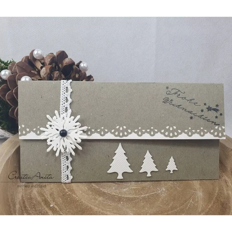 für Weihnachten mit handgestanzter Bordüre und Christbäumen dekoriert.