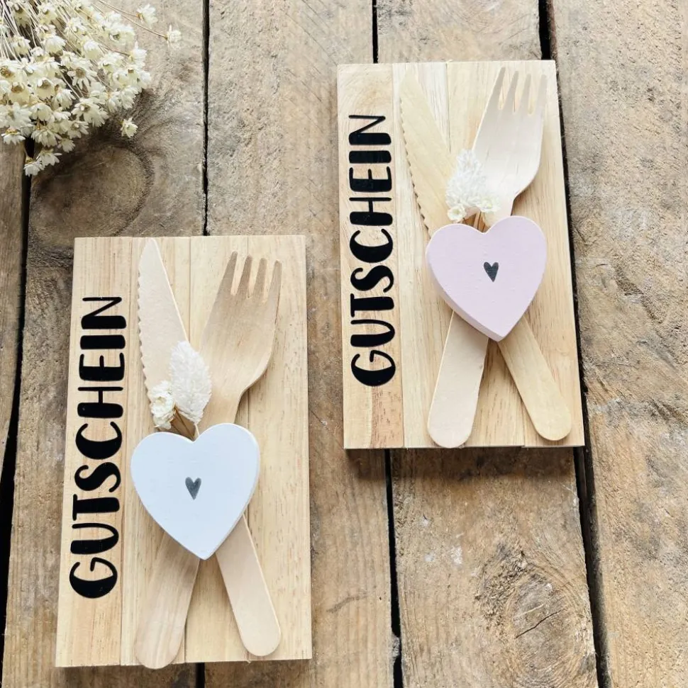 Du möchtest einen Gutschein für ein gemeinsames Essen oder einen Restaurantbesuch verschenken? Mit diesem Gutschein aus Holz ist das eine ganz besonders hübsche Idee.