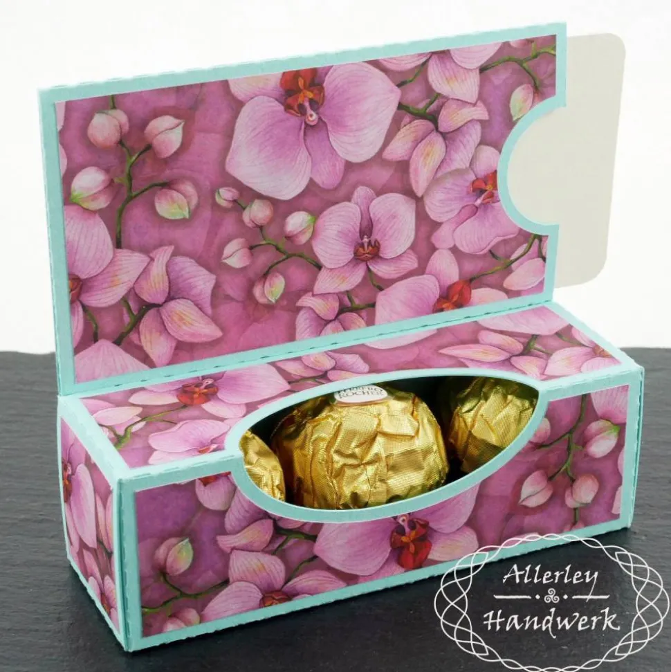 In die Box mit (gänzlich offenem!) Sichtfenster passen drei der goldenen Kugeln einer bekannten Süßigkeitenfirma oder natürlich jedwedes andere Geschenk, was der Größe der Box entspricht (und nicht herausfallen kann).