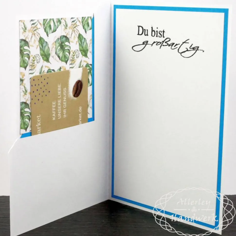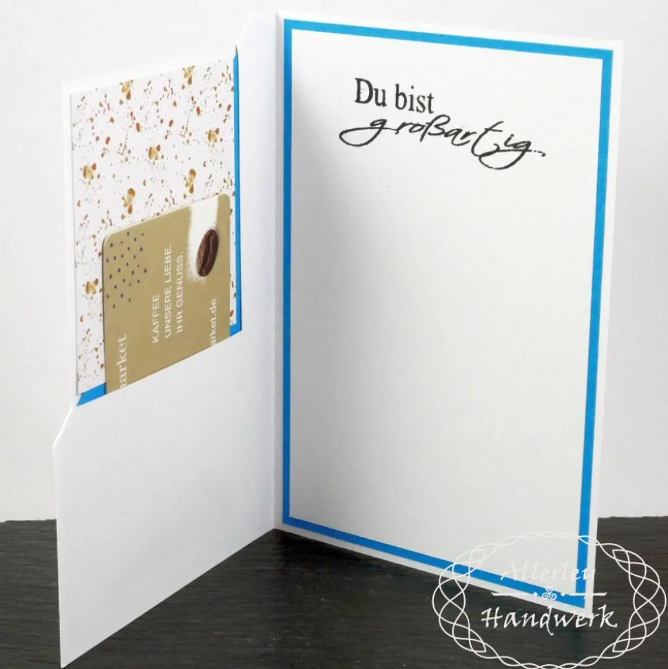 Durch das pfiffige Design mit einem „Eselsohr“ auf der Vorderseite entsteht nicht nur ein schöner farblicher Absatz sondern gleichzeitig auch eine Einsteckmöglichkeit für eine Gutscheinkarte auf der Innenseite. Es passen alle Gutscheine im klassischen Scheckkartenformat hinein. Alternativ kann man natürlich auch direkt einen gefalteten Geldschein oder andere passende Dinge unterbringen, ganz nach Wunsch.
