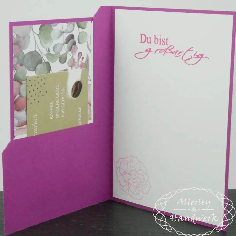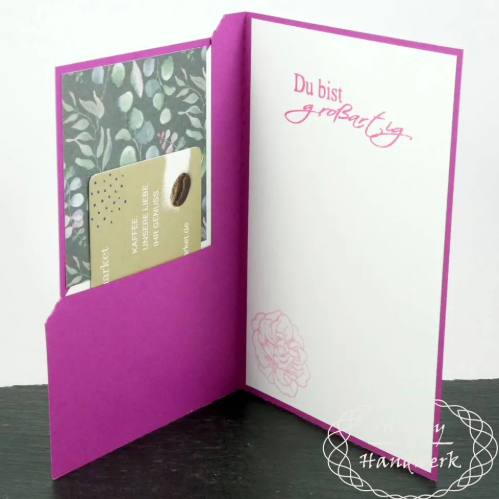 Durch das pfiffige Design mit einem „Eselsohr“ auf der Vorderseite entsteht nicht nur ein schöner farblicher Absatz sondern gleichzeitig auch eine Einsteckmöglichkeit für eine Gutscheinkarte auf der Innenseite. Es passen alle Gutscheine im klassischen Scheckkartenformat hinein. Alternativ kann man natürlich auch direkt einen gefalteten Geldschein oder andere passende Dinge unterbringen, ganz nach Wunsch.