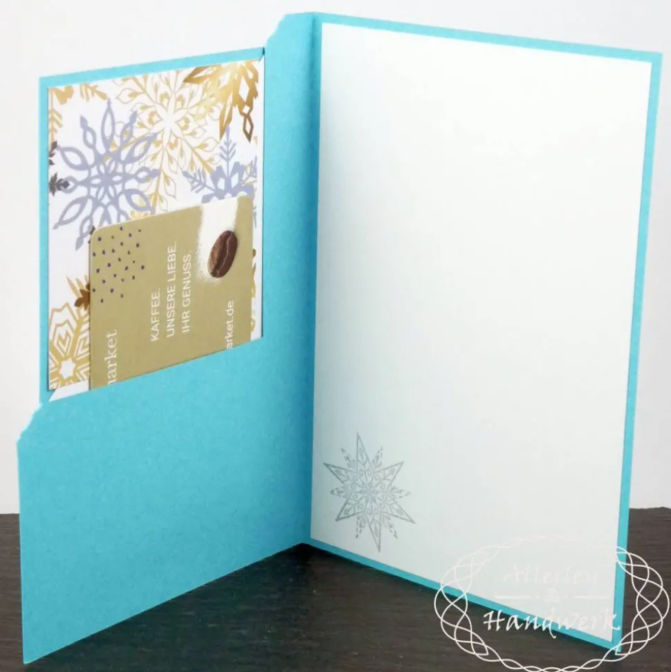 Durch das pfiffige Design mit einem „Eselsohr“ auf der Vorderseite entsteht nicht nur ein schöner farblicher Absatz sondern gleichzeitig auch eine Einsteckmöglichkeit für eine Gutscheinkarte auf der Innenseite. Es passen alle Gutscheine im klassischen Scheckkartenformat hinein. Alternativ kann man natürlich auch direkt einen gefalteten Geldschein oder andere passende Dinge unterbringen, ganz nach Wunsch.
