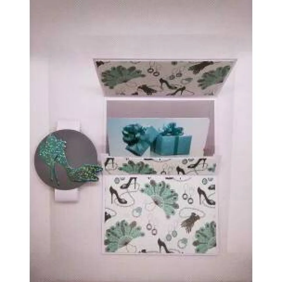 Verwendet habe ich hier eine weiße Grundkarte, Designpapier in türkis-gemustert, grauen Karton, weißen Karton, Text „Gutschein“ in türkis