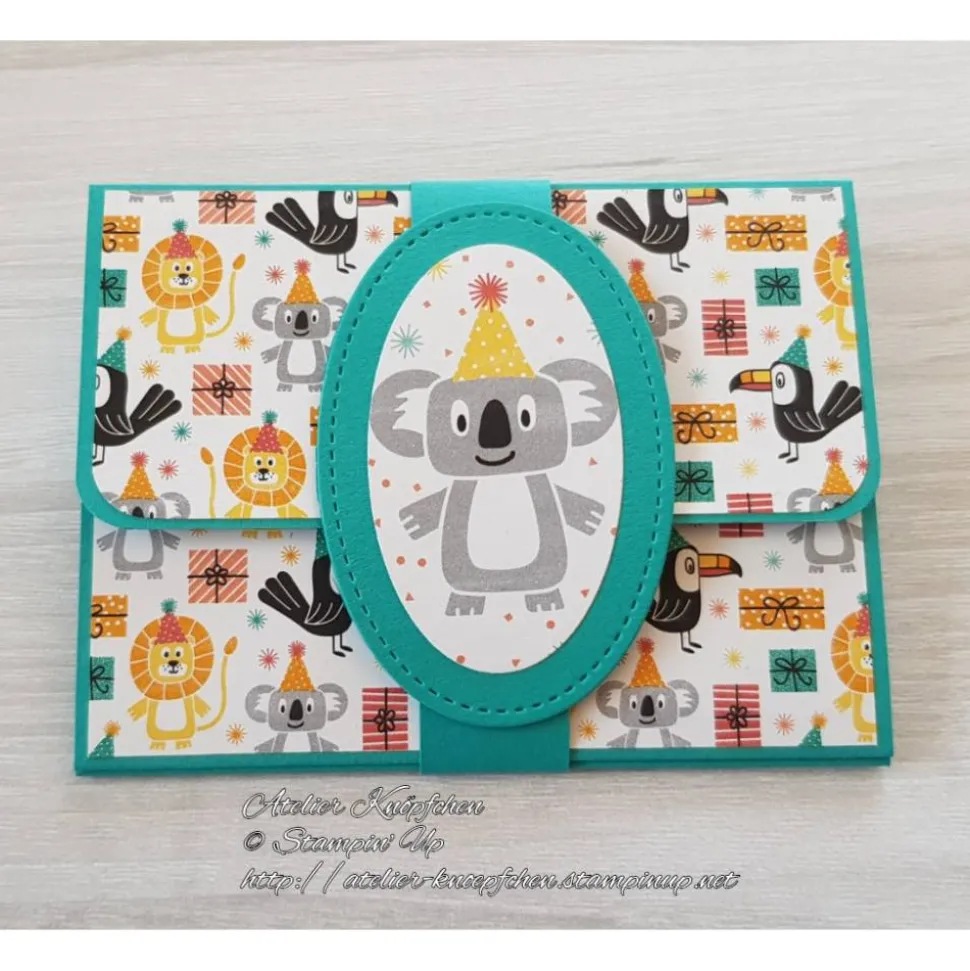 Die Karte wird mit einer Banderole zusammengehalten, die nach links und rechts von der Karte heruntergeschoben werden kann. Auf der Banderole befindet sich ein Etikett mit einem Koala Bären inkl. Partyhut.