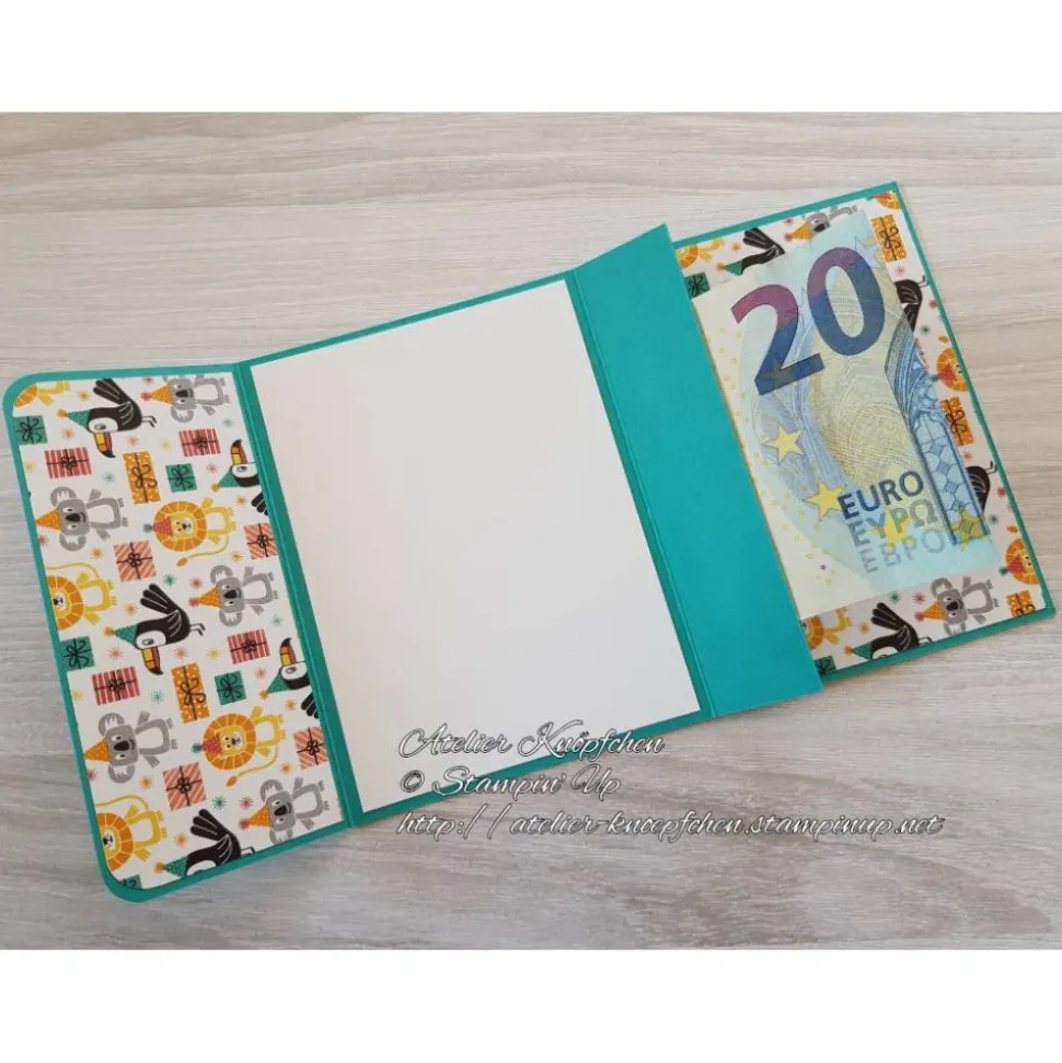 Sowohl außen, als auch innen befindet sich Designerpapier mit kleinen Partytieren und Geschenken drauf.
