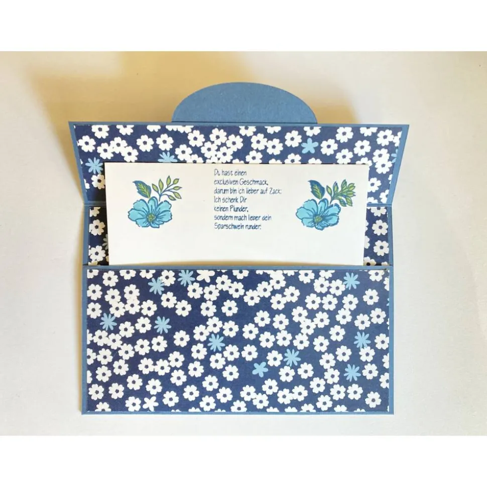 Dann ist diese handgearbeitete, liebevoll gestaltete Geldkarte vielleicht etwas für Sie. Wenn die Karte geöffnet wird, wird gleichzeitig ein Schiebefach geöffnet. In dieses Fach können Sie Geld legen. Die Karte wurde aus hochwertigen Materialien handgefertigt, mit Stempeln, Stanzen, Karton und Designpapier von Stampin’up!