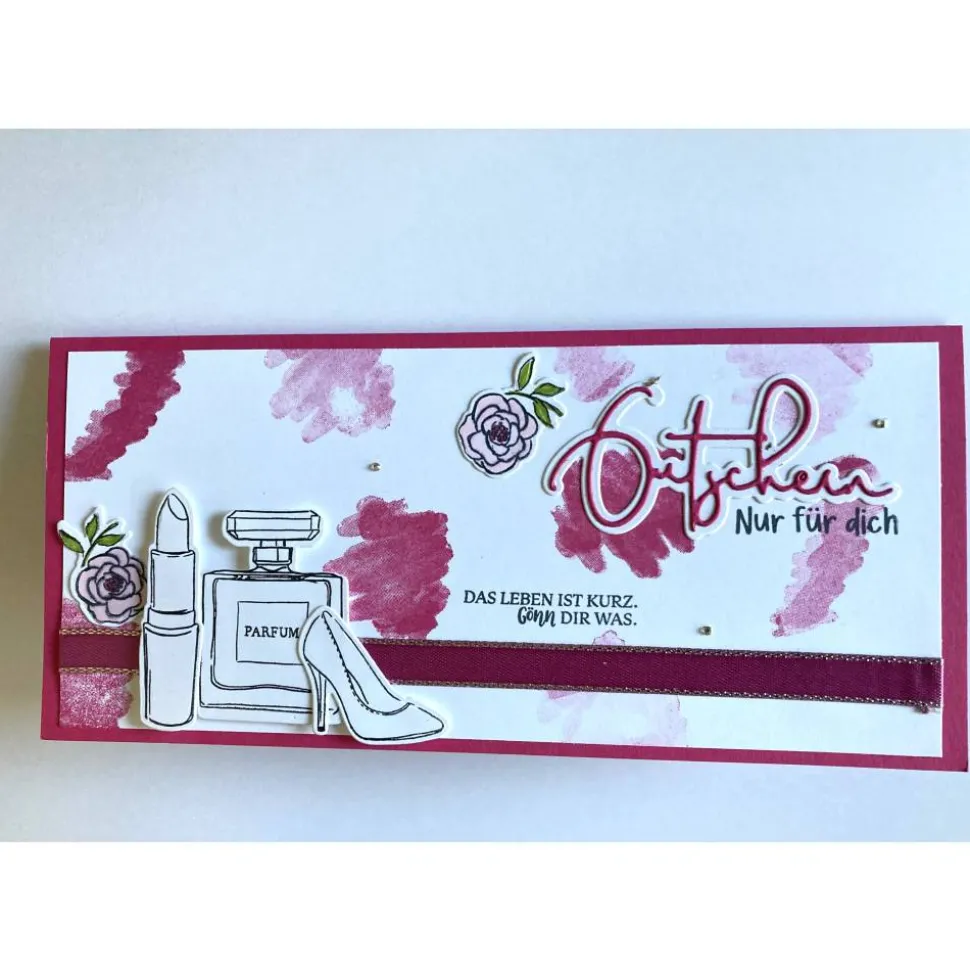Verschenke Freude mit einer einzigartigen Gutscheinverpackung! Diese in reiner Handarbeit gefertigte Glückwunschkarte ist das ideale Geschenk für zahlreiche Anlässe wie Muttertag, Geburtstag oder einfach, um lieben Menschen eine Freude zu bereiten. Das besondere Design mit Lippenstift, Parfüm und Pumps macht die Karte zu einem echten Hingucker – besonders für Frauen, die das Außergewöhnliche schätzen.