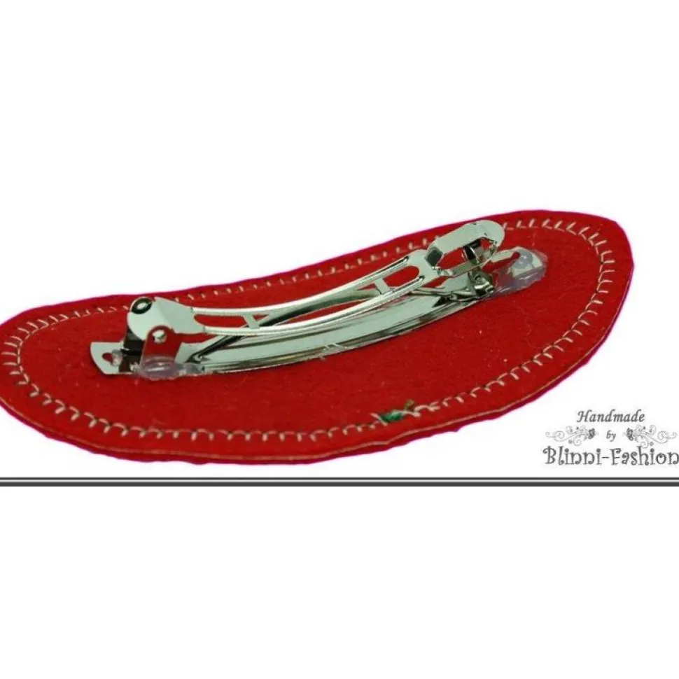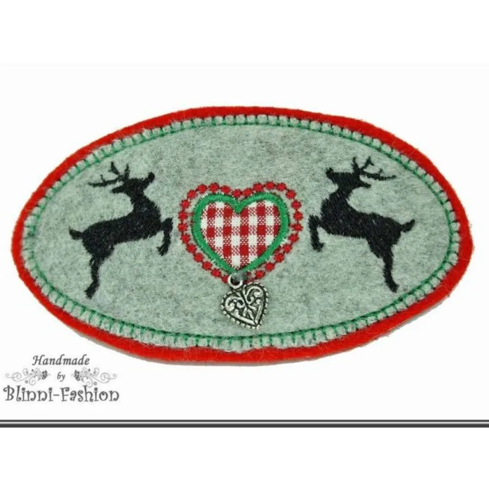 Wunderschöne Haarspange aus einem Kashmir/Wollstoff und Filz bestickt mit 2 Hirschen und einem Herz an dem ein kleines Metallherz baumelt.