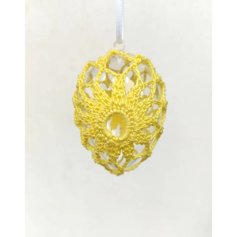 zauberhaftes, dekoratives Häkelei aus sonnengelbem Baumwollgarn. Mit einem Satinbändchen lässt sich das Ei an einen Osterstrauß, Kranz die Türklinke, Schrank oder ein kleines Geschenk anhängen. Ohne das Bändchen kann das Ei sich auch zwischen anderen Osterdekos verstecken. Bei diesem Angebot handelt es sich nur um das Ei auf dem ersten Foto!