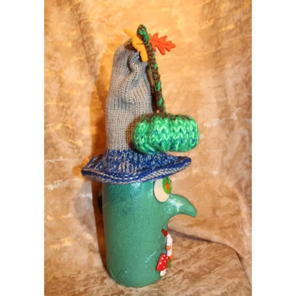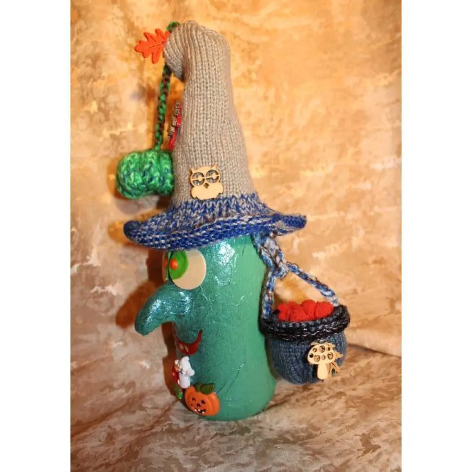 Mit diesem witzigen Upcycling-Unikat verwandelst Du jedes Halloween in ein echtes Highlight. Die Hexe besteht aus einer Sektflasche, liebevoll mit handgestrickten Accessoires dekoriert und mit Acrylfarben bemalt. Ein handgestrickter, giftgrüner Kürbis und ein Hexenkessel dekoriert den handgestrickten Hexenhut-