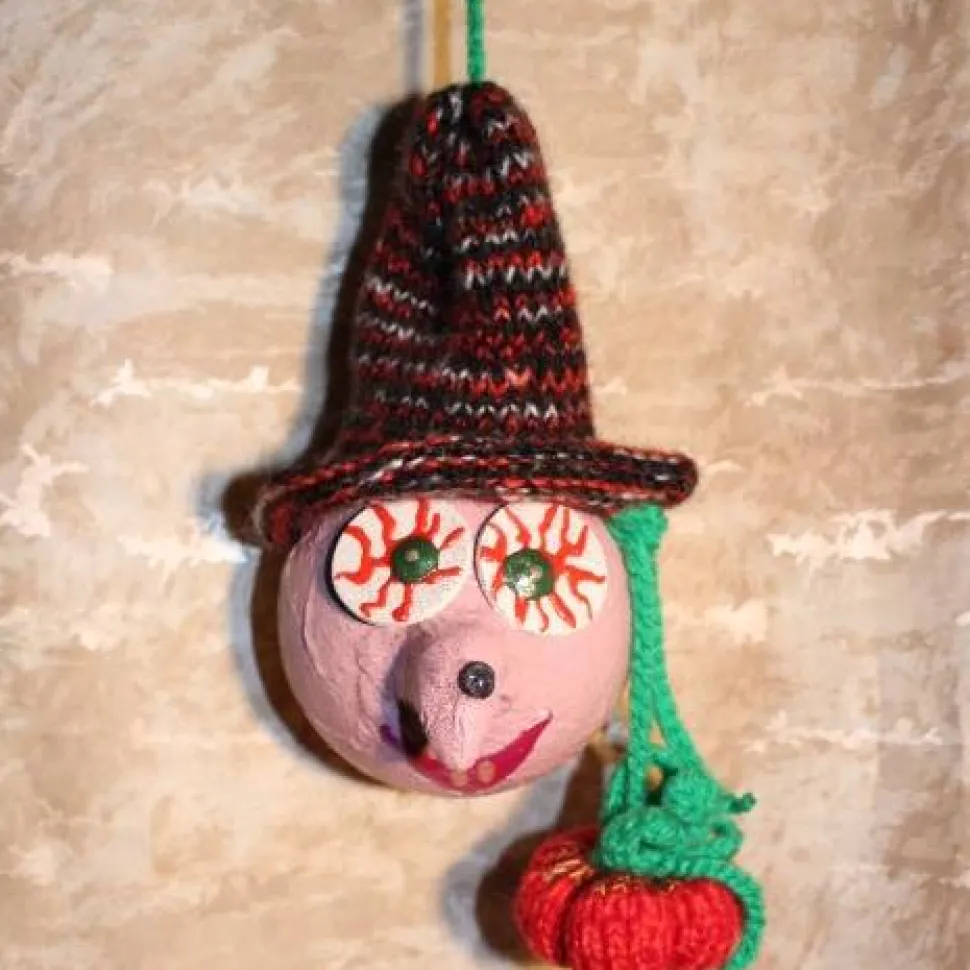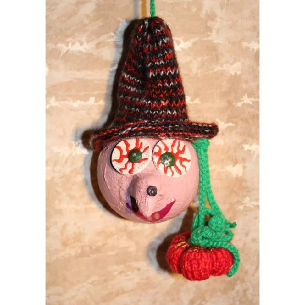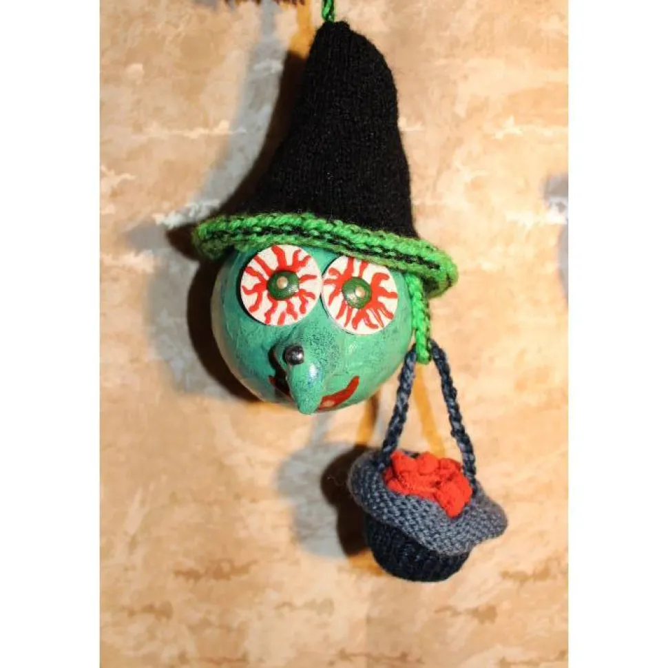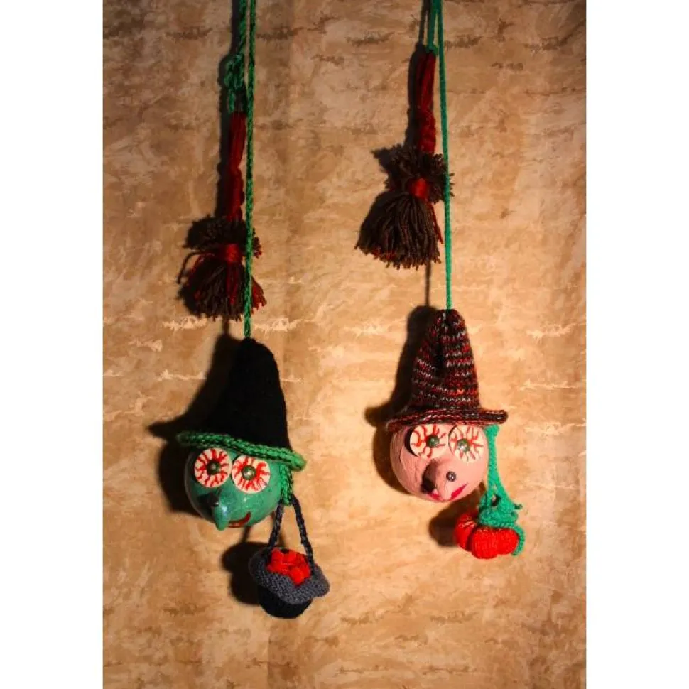Mit diesen witzigen Unikaten verwandelst Du jedes Halloween in ein echtes Highlight. Das Hexenset besteht aus zwei Kunststoffkugeln, liebevoll mit handgestrickten Accessoires dekoriert und mit Acrylfarben bemalt. Die grüne Hexe ist mit einem Besen aus Wolle und einem kleinen gestrickten Hexenkessel dekoriert, die rosa Hexe ist mit einem Besen und einem handgestrickten Kürbis dekoriert.