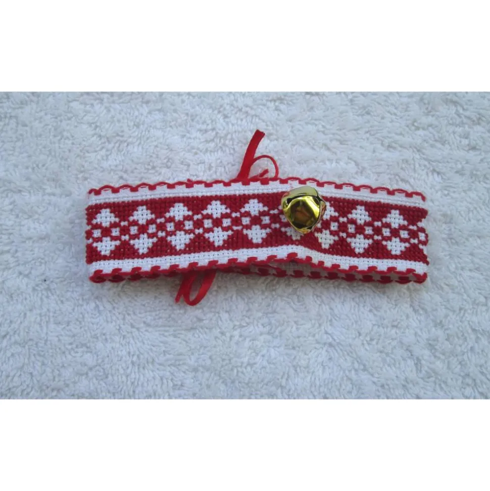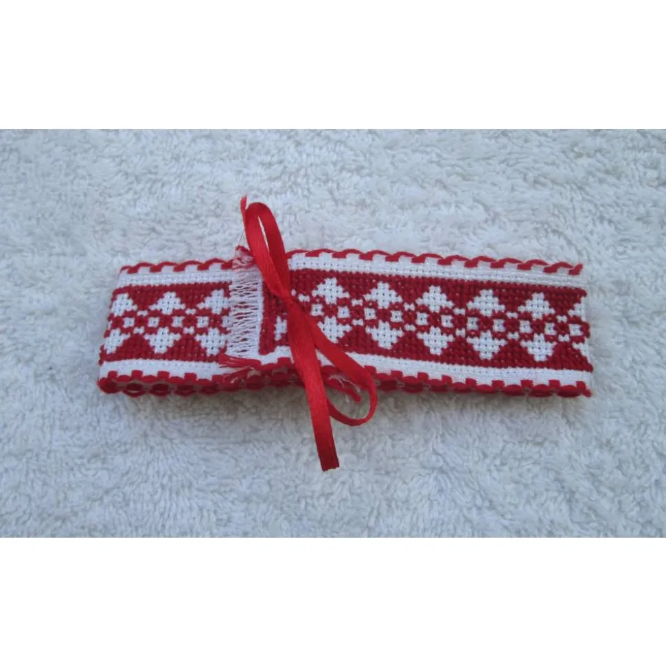 Kreuzstich Motiv auf fein gewebten Aida Band, mit rotem Randmuster.