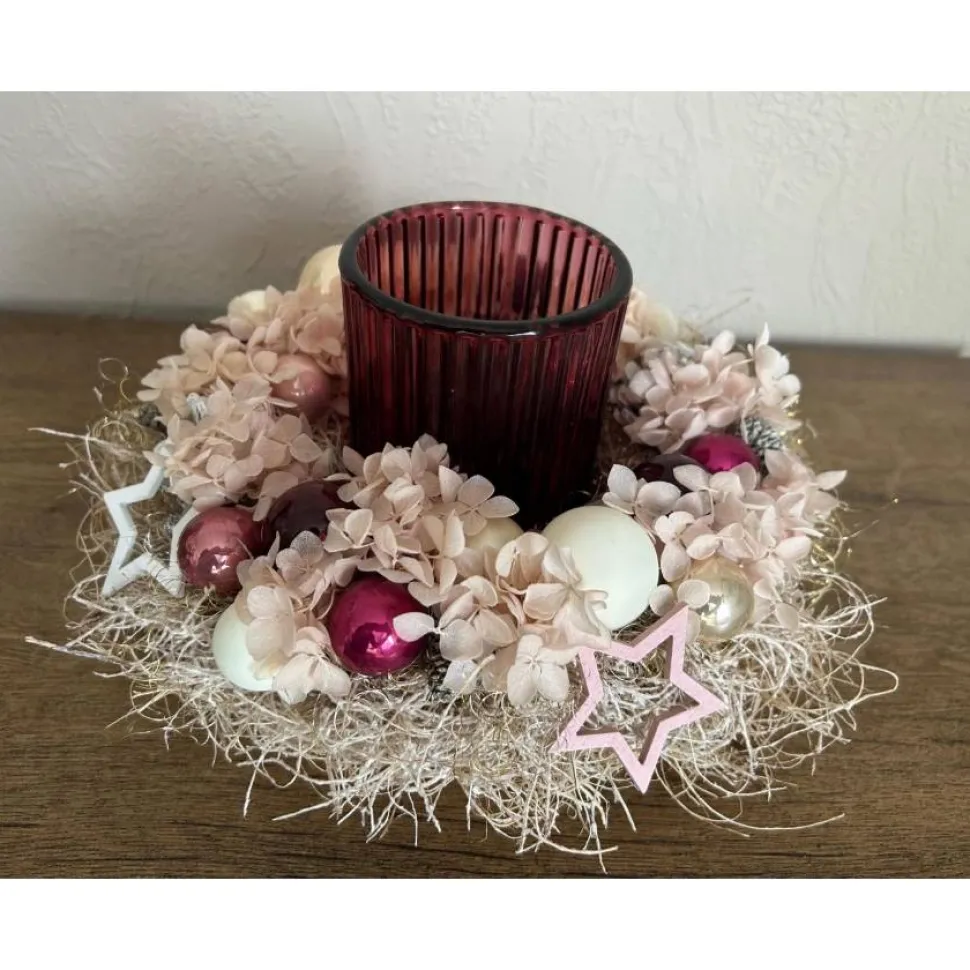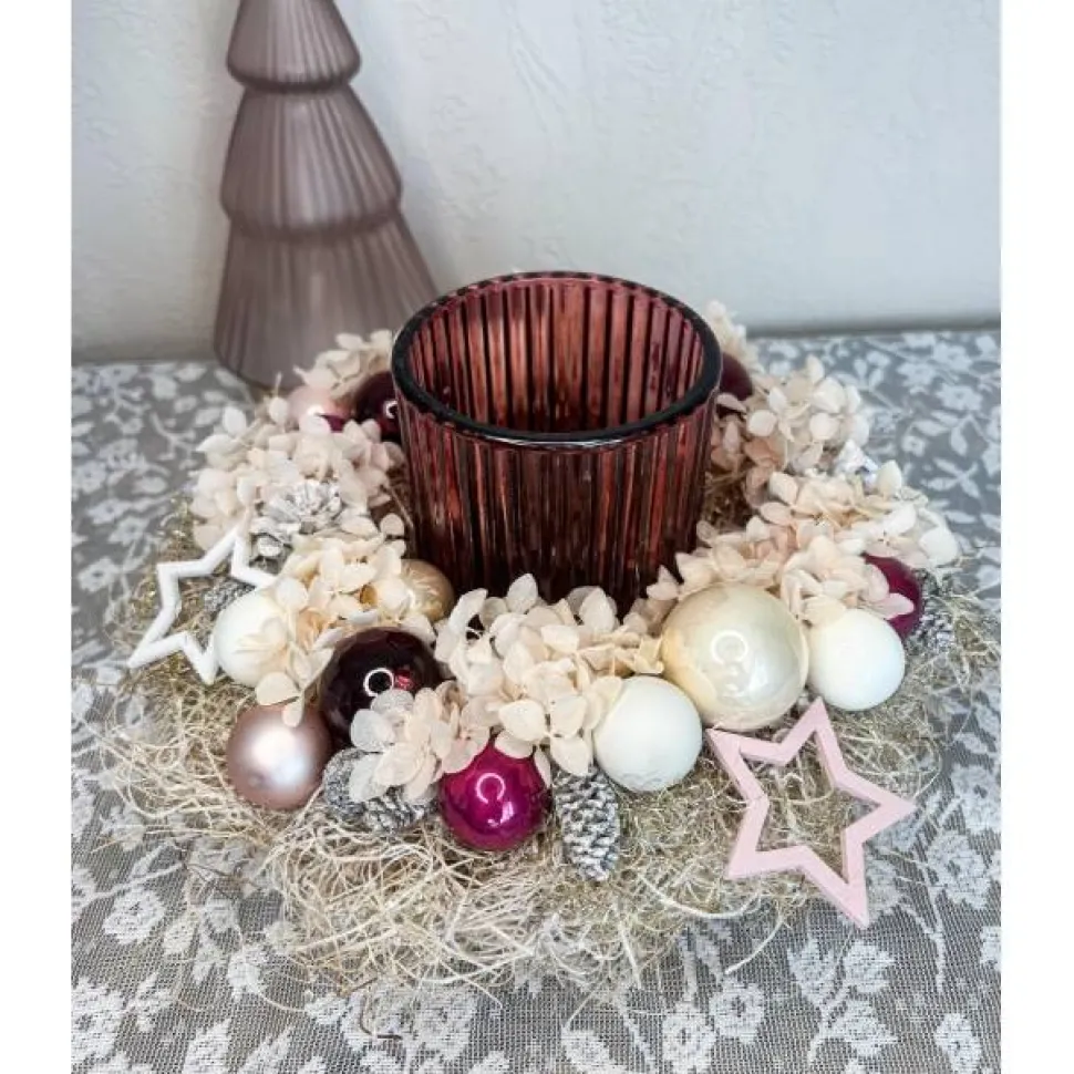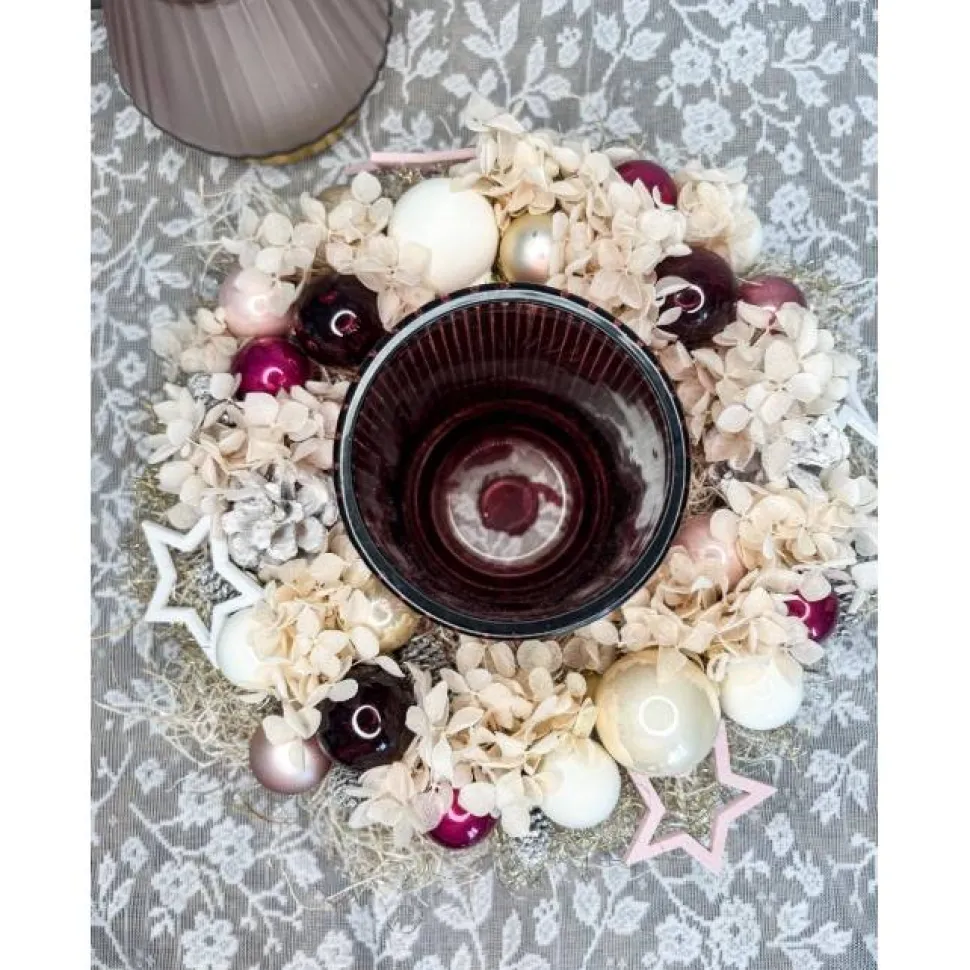Dieser kleine Adventskranz in Beeren und rosa töne ist die perfekte Ergänzung für deine festliche Dekoration. Der Kranz präsentiert sich in natürlicher Optik mit einem eleganten Glas Windlicht in der Mitte, liebevoll verziert mit konservierten Hortensien in rosa und weißen Zapfen. Die funkelnde Glaskugeln setzen glänzende Akzente. Abgerundet wird das Design mit charmanten Holzsternen. Der Kranz wird mit Liebe zum Detail handgefertigt – ideal als Geschenk oder zum Selbstbehalten für alle, die Beerentöne und Rosa lieben.