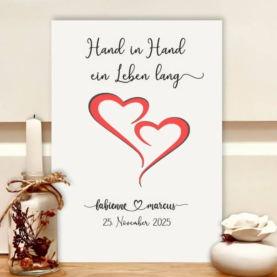 Das Bild im A4-Format wird auf 300g starkem Strukturkarton gedruckt und erhält mit dem beiliegenden roten Papier einen besonderen Hintergrund – auch ohne Geldscheine ein echter Hingucker. Das Herzstück des Designs ist der emotionale Spruch „Hand in Hand ein Leben lang“, der perfekt den gemeinsamen Start in die Ehe symbolisiert.