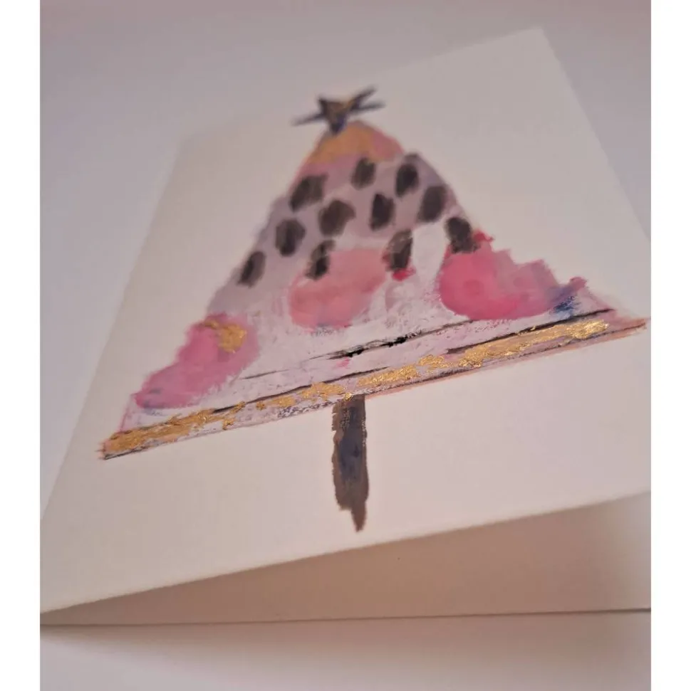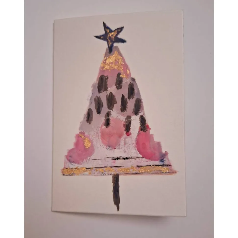 Diese besondere Doppelkarte wurde von Hand gestaltet und ist ein echtes Einzelstück. Der moderne Weihnachtsbaum in vibrierenden Farbtönen wird durch feine Gold-Akzente veredelt und wirkt zugleich frisch und festliche.Ideal als besonderer Gruß, kleine Kunstkarte zum Verschenken oder zum Einrahmen.