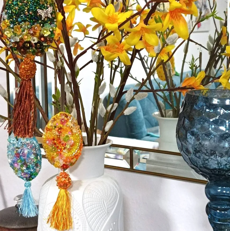 Jedes dieser prunkvollen Ornamente ist ein liebevoll gefertigtes Einzelstück aus Deutschland und passt hervorragend zu allen Aquatönen, Blau und Grau. Setze mit diesem handbestickten Ei einen glitzernden Luxus-Akzent – ob am Osterstrauß, Taufgesteck, Weihnachtsbaum oder als dekorativer Schlüsselanhänger.