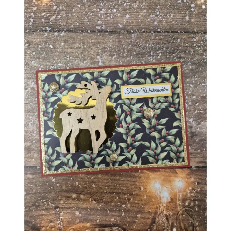 Überrasche deine Liebsten mit einer einzigartigen, handgefertigten Weihnachtskarte! Diese stilvolle Karte besticht durch detailreiche, weihnachtliche Motive: hochwertiges Motivpapier, ein liebevoll gefertigtes Rentier aus Holz, edle Outline Stickers sowie funkelnde Glitzersteinchen.