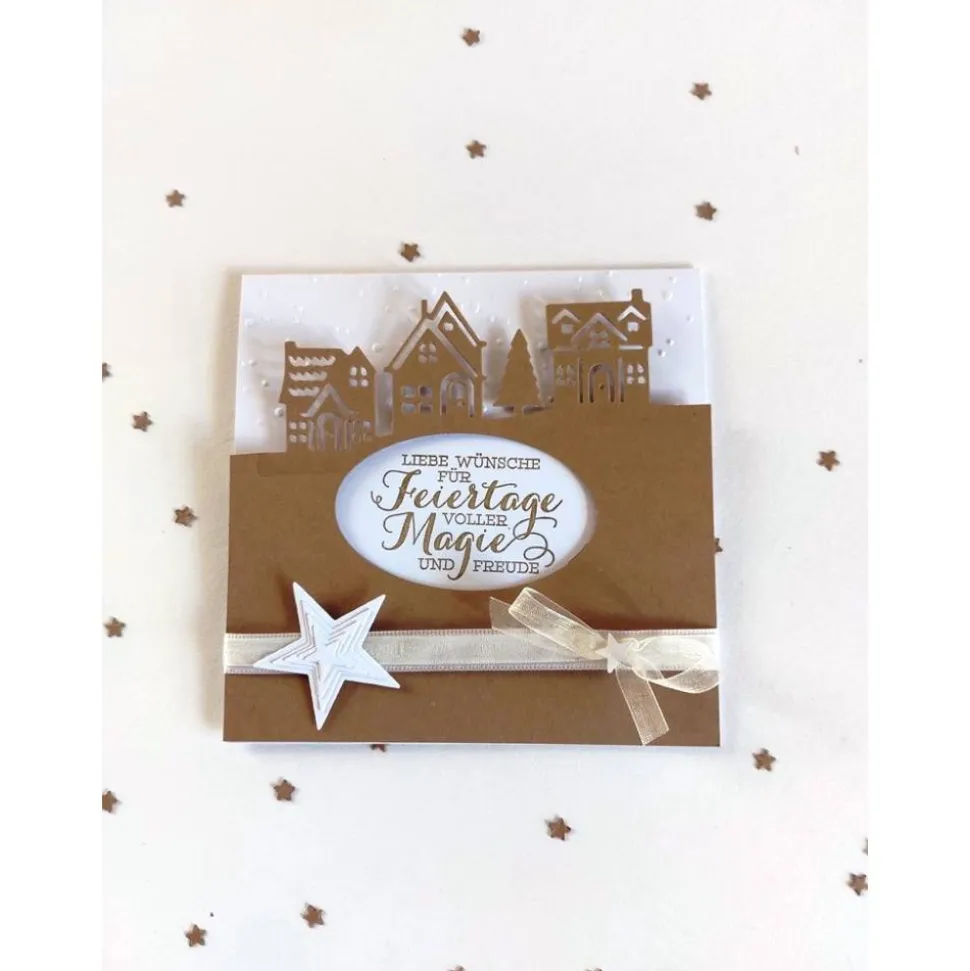 Entdecke eine eindrucksvolle Weihnachtskarte, die liebevoll in Handarbeit gefertigt wurde. Die quadratische Karte in weiß/braun mit Teilprägung bringt mit ihrer Dorflandschaft eine weihnachtliche Stimmung in dein Zuhause.